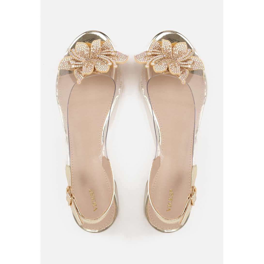 Sandały damskie z transparentnym paskiem przy nosku i ozdobą w formie biżuteryjnego kwiatu, które wyróżniają się eleganckim wykończeniem. Wykonane ze skóry ekologicznej, z wkładką z ekoskóry, osadzone na stabilnym niskim obcasie o geometrycznym kształcie. Model z odkrytym noskiem, zapinany na pasek przy pięcie ze sprzączką, idealny na sezon wiosenno-letni, w stylu eleganckim.