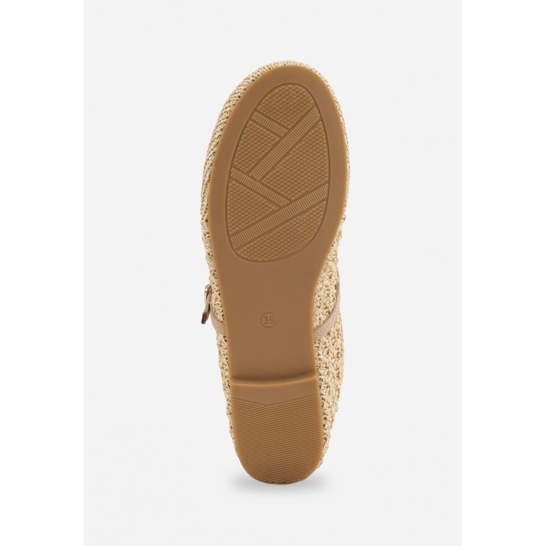 Ażurowe baleriny damskie z wyraźnie zaznaczonym, okrągłym noskiem i paskiem zapinanym na sprzączkę, które podkreślają elegancki charakter modelu. Wykonane z materiału o plecionej strukturze, z wkładką wykończoną ekoskórą oraz osadzone na niskim, płaskim obcasie; idealne na sezon wiosenno-letni. Styl casual i klasyczny wzbogaca subtelne zdobienie w formie dekoracyjnego paska, tworząc uniwersalną propozycję do hurtowej oferty obuwia damskiego Vices.eu.
