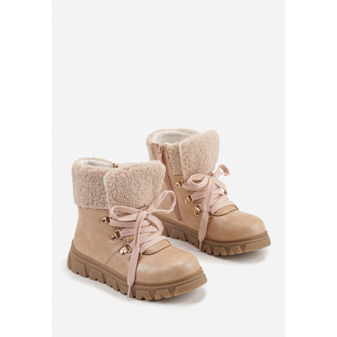 Botki ocieplane na grubej podeszwie z wysoką cholewką. Wykonane z wysokiej jakości skóry ekologicznej, posiadają komfortową wkładkę z ekoskóry. Zapięcie na sznurówki oraz ozdobne detale w postaci złotych elementów podkreślają nowoczesny styl, idealny na sezon zimowy.