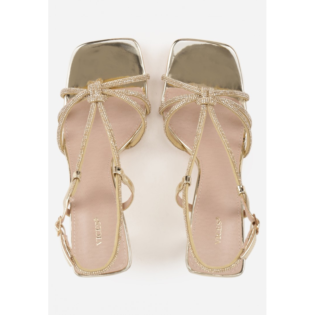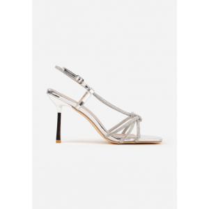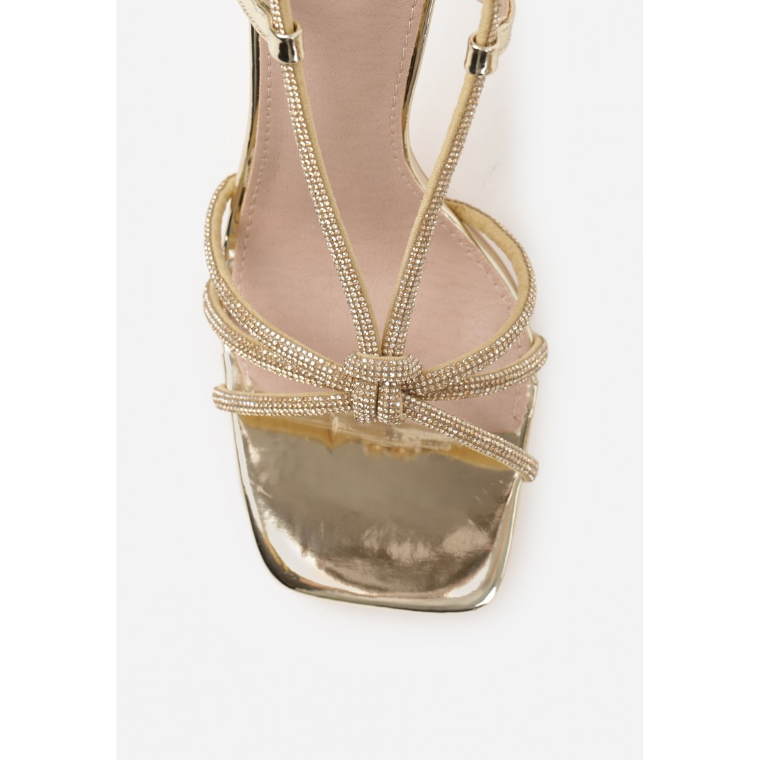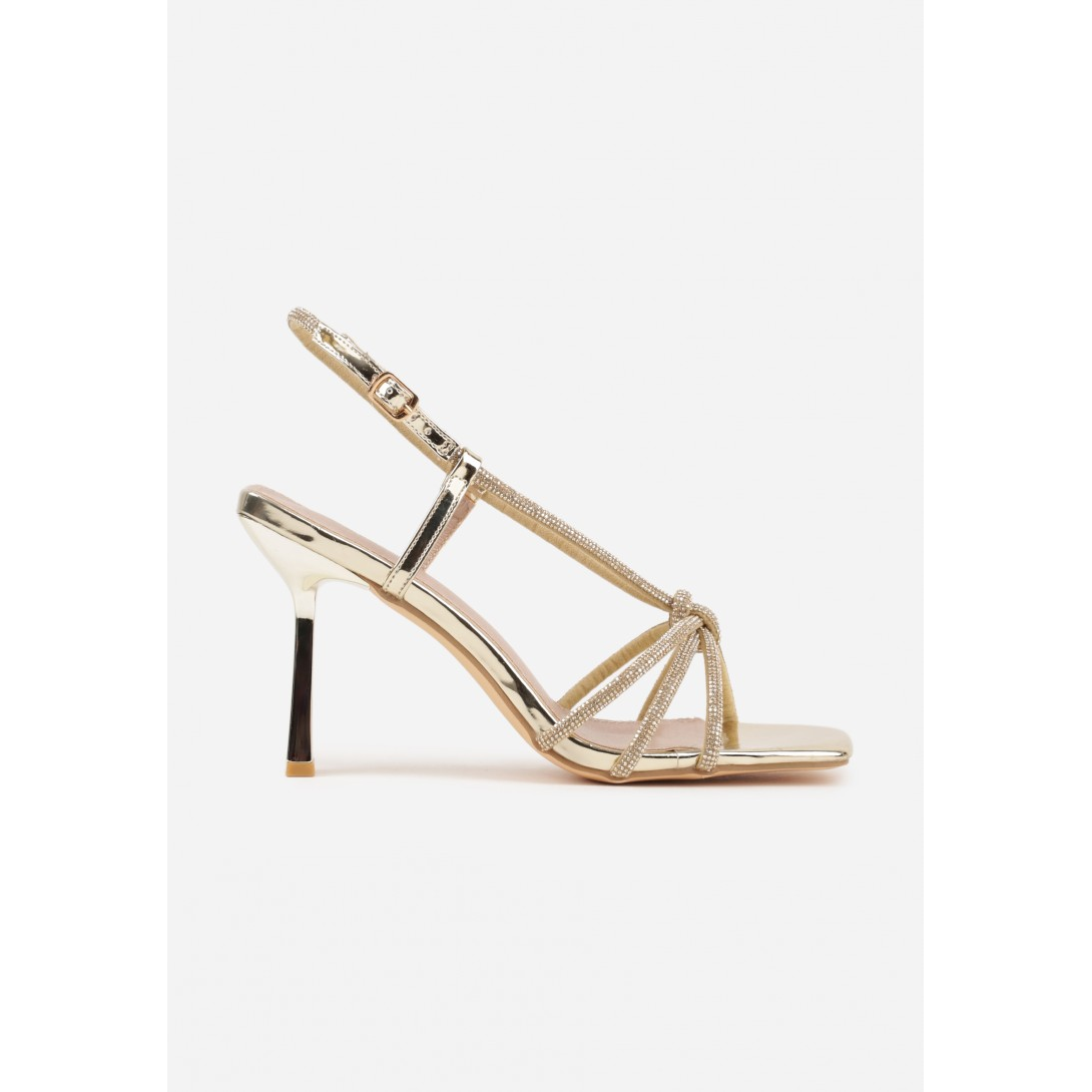 Sandały damskie na smukłej szpilce typu kielichowego, wykonane z materiału syntetycznego z błyszczącymi zdobieniami. Model z kwadratowym noskiem, odkrytą konstrukcją i zapięciem wokół kostki na regulowany pasek ze sprzączką, idealny na sezon wiosenno-letni. Styl wieczorowy, z efektownym wzorem pasków i dekoracyjnym węzłem na przodzie.