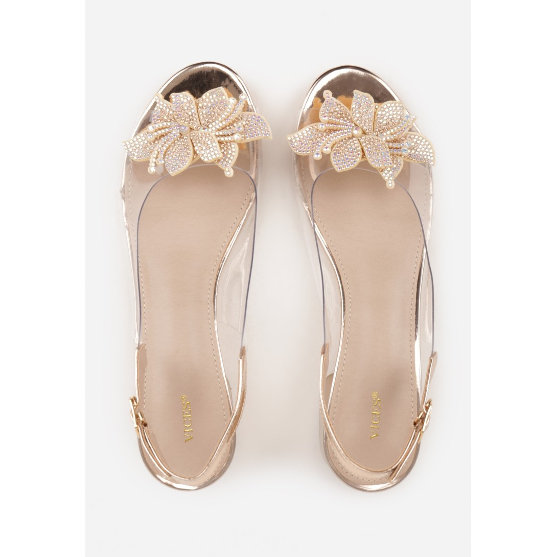 Sandały damskie z transparentnym paskiem przy nosku i ozdobą w formie biżuteryjnego kwiatu, które wyróżniają się eleganckim wykończeniem. Wykonane ze skóry ekologicznej, z wkładką z ekoskóry, osadzone na stabilnym niskim obcasie o geometrycznym kształcie. Model z odkrytym noskiem, zapinany na pasek przy pięcie ze sprzączką, idealny na sezon wiosenno-letni, w stylu eleganckim.