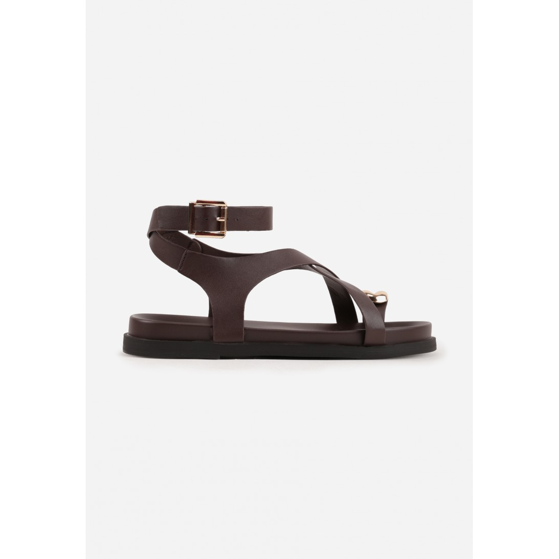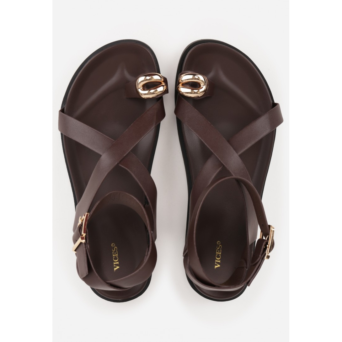 Sandały damskie z paskami krzyżującymi się przy palcach oraz zapięciem na klamrę wokół kostki, osadzone na płaskiej podeszwie. Wykonane ze skóry ekologicznej, z wkładką z ekoskóry i otwartym, odkrytym noskiem. Model w stylu casual na sezon wiosna-lato, z eleganckimi metalicznymi zdobieniami i gładkim wzorem, idealny do oferty hurtowej vices.eu.