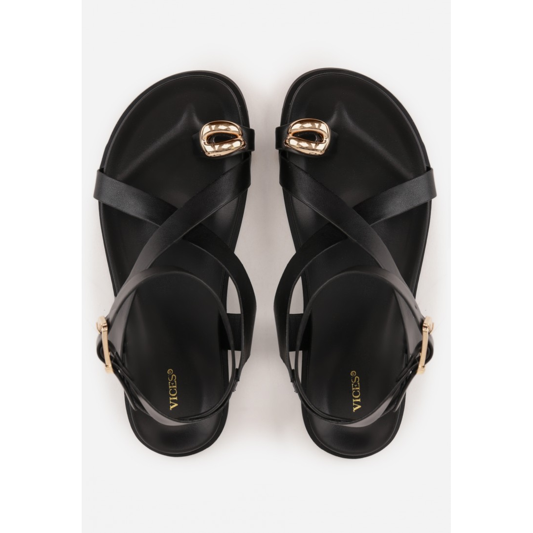 Sandały damskie z paskami krzyżującymi się przy palcach oraz zapięciem na klamrę wokół kostki, osadzone na płaskiej podeszwie. Wykonane ze skóry ekologicznej, z wkładką z ekoskóry i otwartym, odkrytym noskiem. Model w stylu casual na sezon wiosna-lato, z eleganckimi metalicznymi zdobieniami i gładkim wzorem, idealny do oferty hurtowej vices.eu.