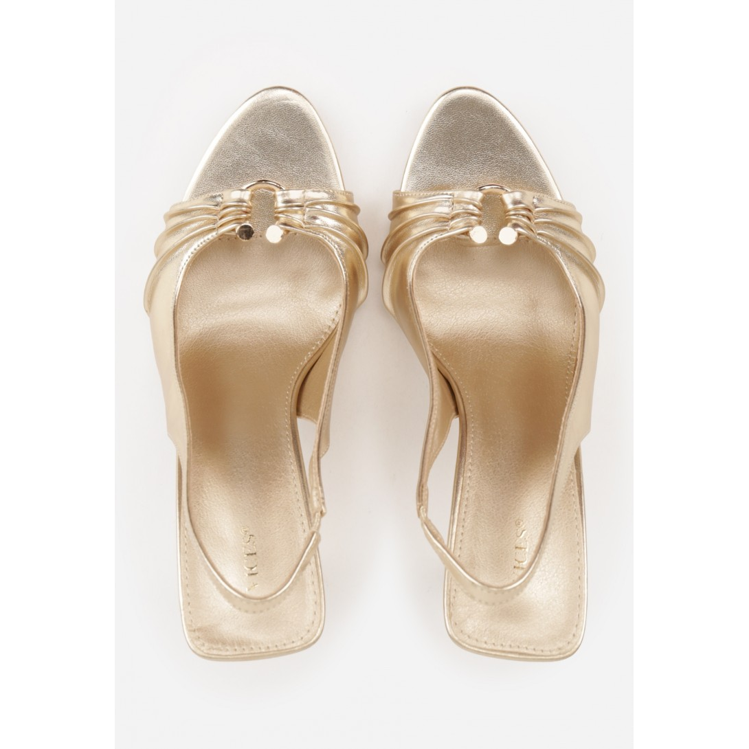 Sandały damskie na smukłej szpilce, wykonane z ekoskóry, z odkrytym noskiem i regulowanym zapięciem na pasek wokół pięty. Wkładka/wyściółka z ekoskóry, fason utrzymany w eleganckim stylu z subtelnym, efektownym zdobieniem przy pasku. Model idealny na sezon wiosenno-letni, z gładkim wzorem i dopracowaną formą wpisującą się w ofertę hurtową vices.eu.