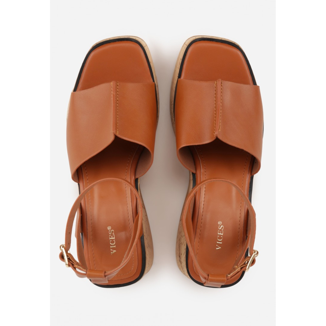 Sandały damskie na wysokiej koturnie z platformą, wykonane z ekoskóry, z wkładką i wyściółką ze skóry ekologicznej. Model z odkrytym noskiem, zapinany na sprzączkę wokół kostki, utrzymany w stylu casual z gładkim wzorem i dekoracyjną, plecioną podeszwą. Idealne na sezon wiosenno-letni, stanowią stylową propozycję do oferty hurtowej obuwia damskiego vices.eu.
