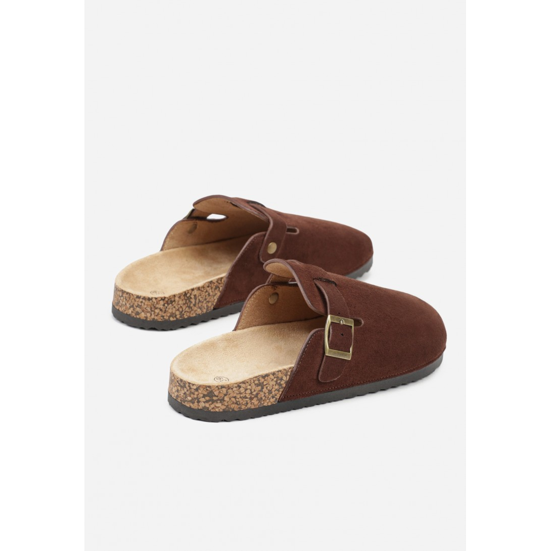 Klapki o płaskim obcasie, idealne na sezon przejściowy. Wykonane z wysokiej jakości materiału syntetycznego z wkładką z ekoskóry, zapewniają wyjątkowy styl. Model z zaokrąglonym noskiem i ozdobnym zapięciem na sprzączkę, idealny do codziennych stylizacji.