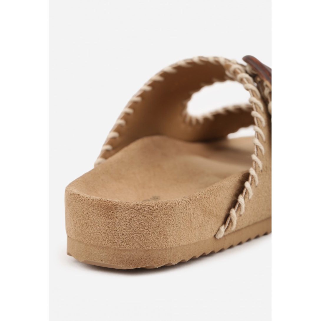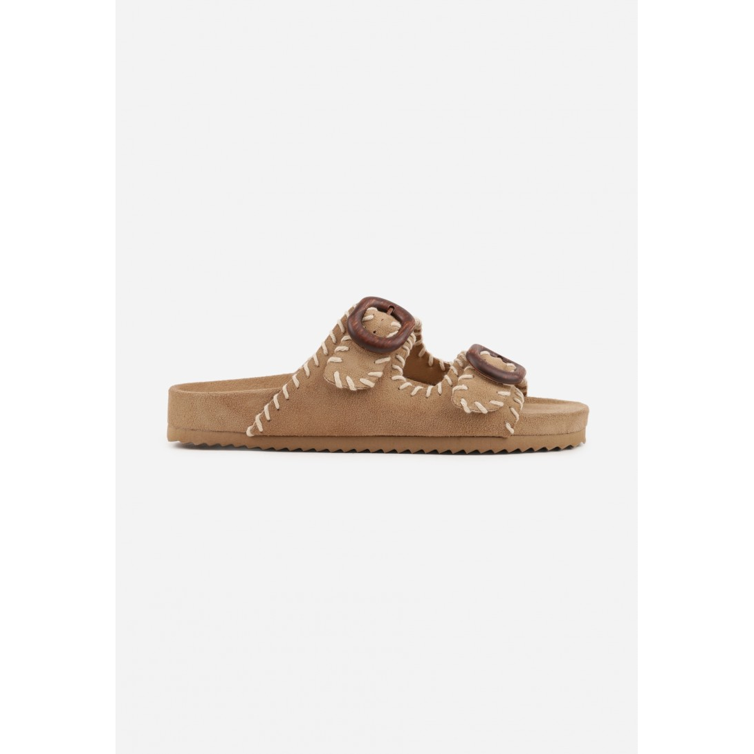 Klapki damskie z szerokimi paskami i ozdobnymi, plecionymi przeszyciami, osadzone na płaskiej podeszwie. Model wykonany z materiału tekstylnego, z wkładką i wyściółką z materiału oraz odkrytym noskiem. Zapinane na sprzączki, utrzymane w stylu casual na sezon letni, z dekoracyjnym wykończeniem podkreślającym charakter obuwia.