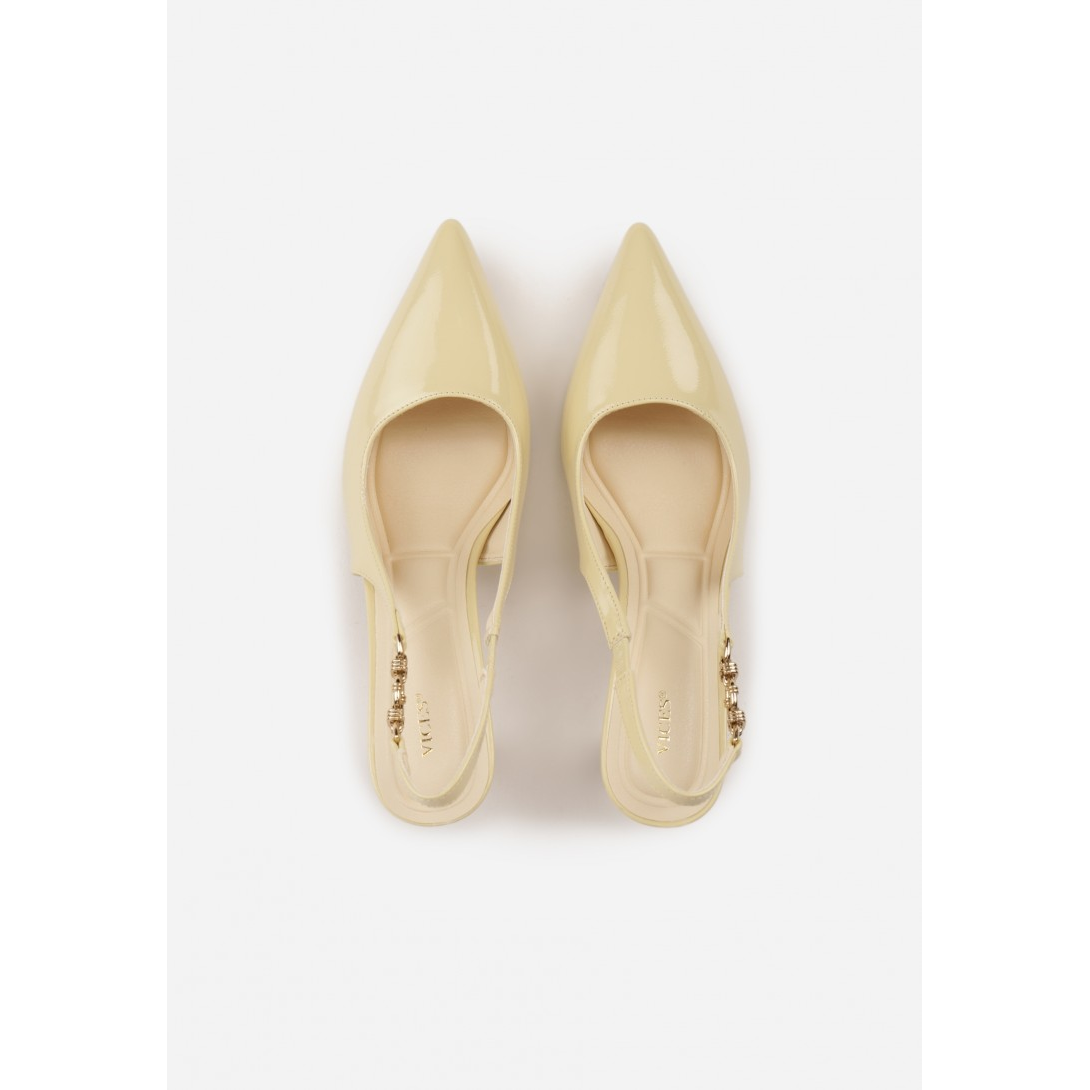 Stylowe czółenka na obcasie, z eleganckim zapięciem na pięcie, wykonane z wysokiej jakości ekoskóry. Noszą one klasyczny, szpiczasty nosek, co nadaje im wyjątkowego charakteru. Osadzone na stabilnym obcasie typu blok, który ma wysokość 7 cm, idealne na wiele okazji.