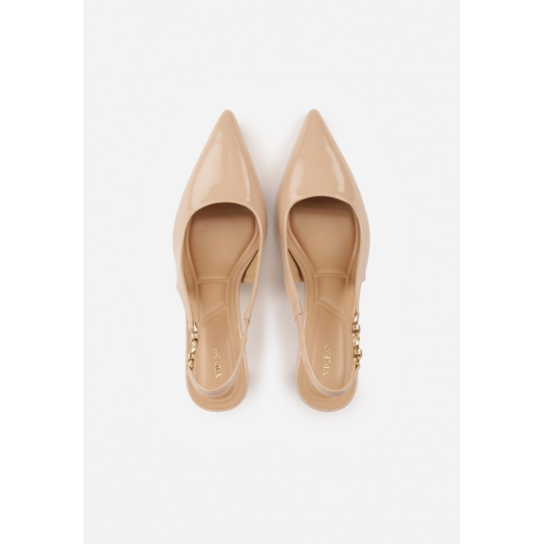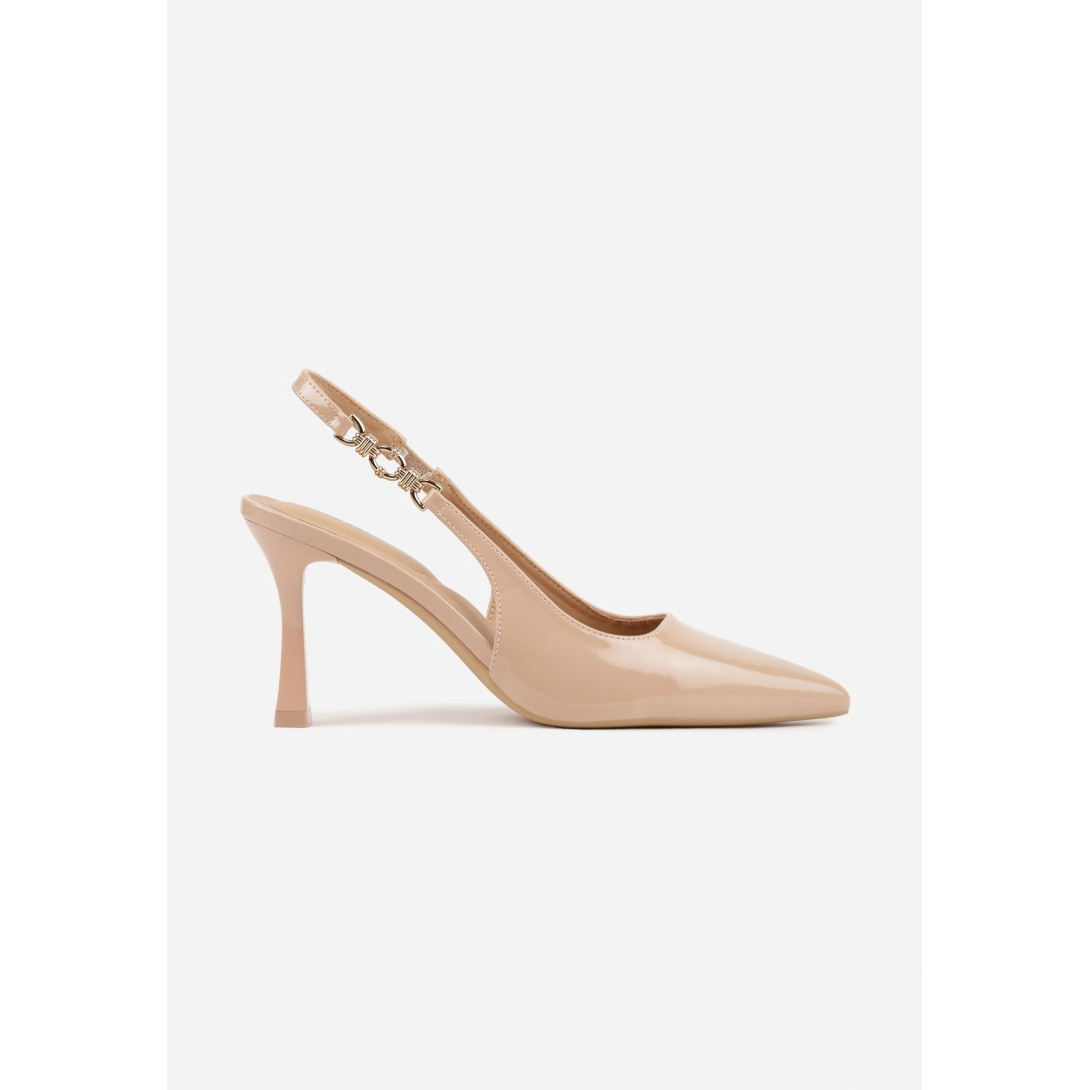 Stylowe czółenka na obcasie, z eleganckim zapięciem na pięcie, wykonane z wysokiej jakości ekoskóry. Noszą one klasyczny, szpiczasty nosek, co nadaje im wyjątkowego charakteru. Osadzone na stabilnym obcasie typu blok, który ma wysokość 7 cm, idealne na wiele okazji.