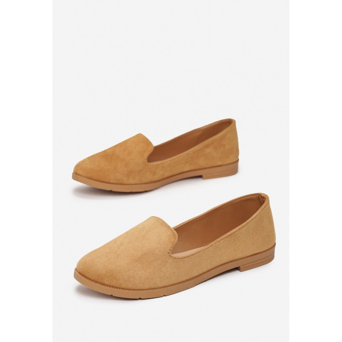 Mokasyny gładkie, wsuwane, z niską cholewką i okrągłym noskiem. Na płaskim obcasie i podeszwie w pasującym kolorze. Wykonane z ekozamszu.