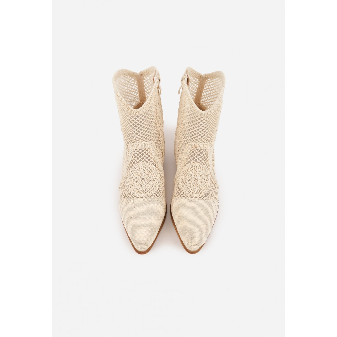 Stylowe botki z obcasem o wysokości 4 cm wykonane z syntetycznego materiału. Posiadają wygodną, skórzaną wkładkę oraz dekoracyjną siateczkę ozdobioną kwiatowymi haftami na cholewce. Zapinane z boku na zamek błyskawiczny, idealne na wiosenne i letnie dni.