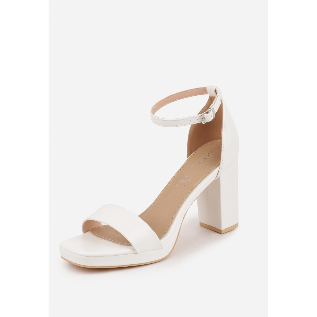 Sandały na wysokim obcasie, z kwadratowym noskiem, idealne na sezon wiosenno-letni. Wykonane z wysokiej jakości materiału syntetycznego, z wkładką z ekoskóry, co zapewnia trwałość i nowoczesny wygląd. Zapięcie na elegancką sprzączkę w kostce oraz efektowny, szeroki obcas o wysokości 8 cm podkreślają ich stylowy charakter.