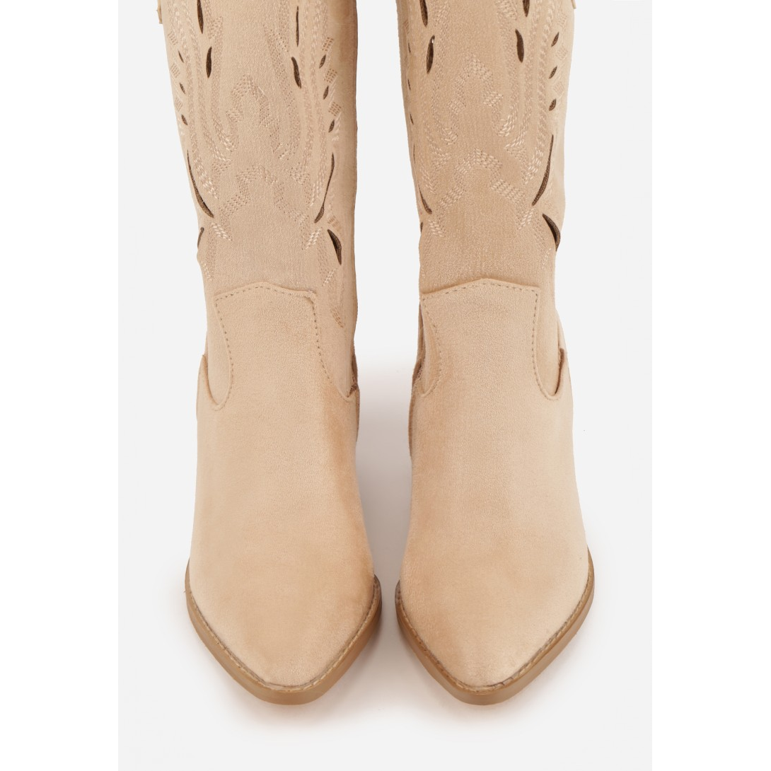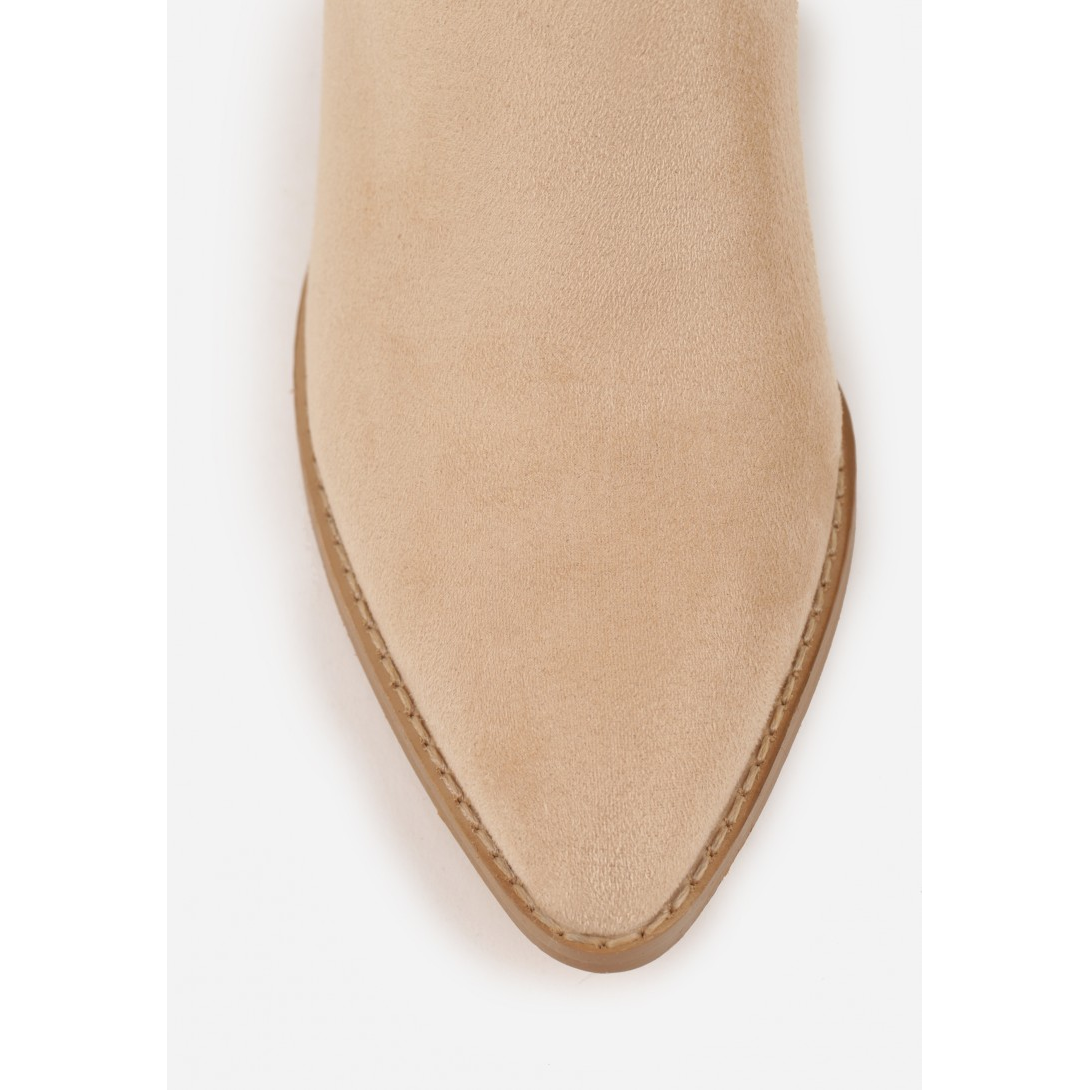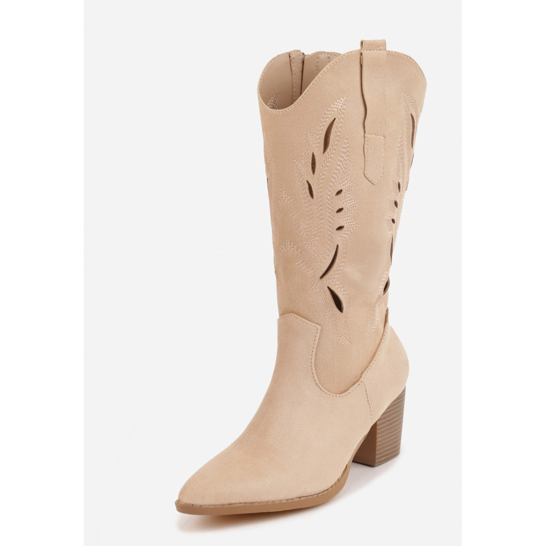 Stylowe kozaki z efektem zamszu, zaprojektowane z eleganckim noskiem w szpic. Wysoki obcas o wysokości 7 cm zapewnia stabilność, a materiał syntetyczny pozwala na zachowanie estetyki i łatwość w pielęgnacji. Urokliwe wycięcia na cholewce nadają modelowi wyjątkowego charakteru, idealnego do casualowych stylizacji.