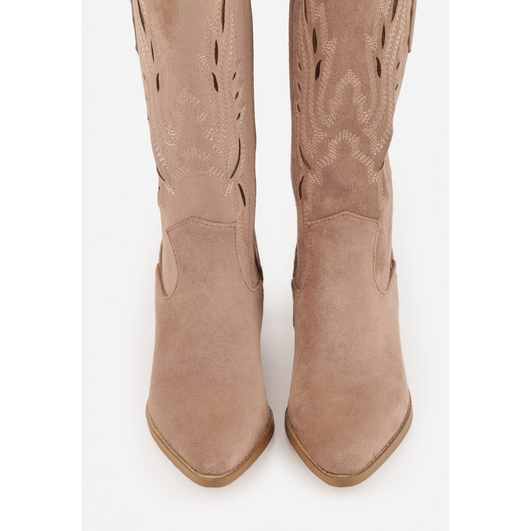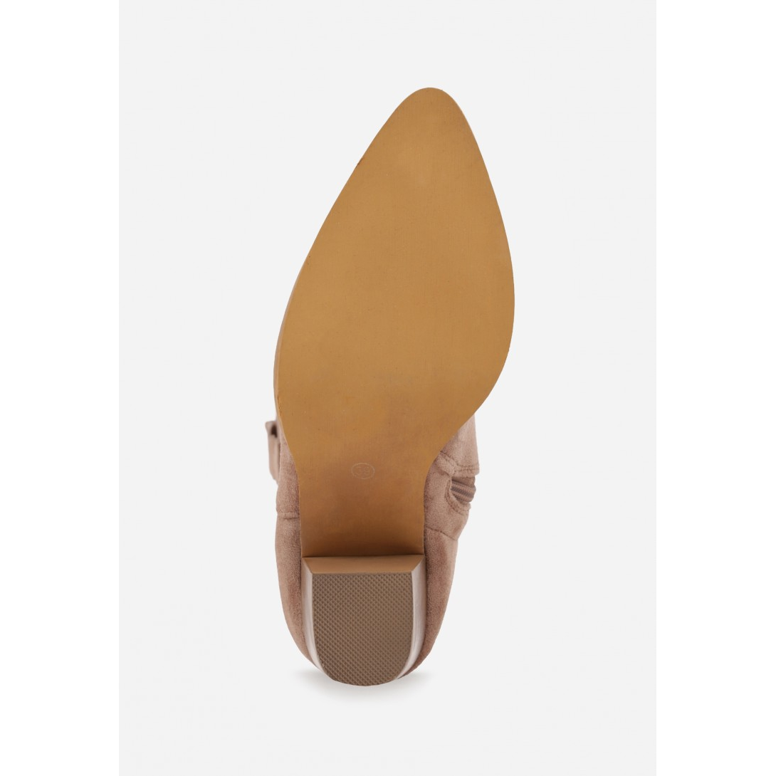 Stylowe kozaki z efektem zamszu, zaprojektowane z eleganckim noskiem w szpic. Wysoki obcas o wysokości 7 cm zapewnia stabilność, a materiał syntetyczny pozwala na zachowanie estetyki i łatwość w pielęgnacji. Urokliwe wycięcia na cholewce nadają modelowi wyjątkowego charakteru, idealnego do casualowych stylizacji.