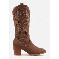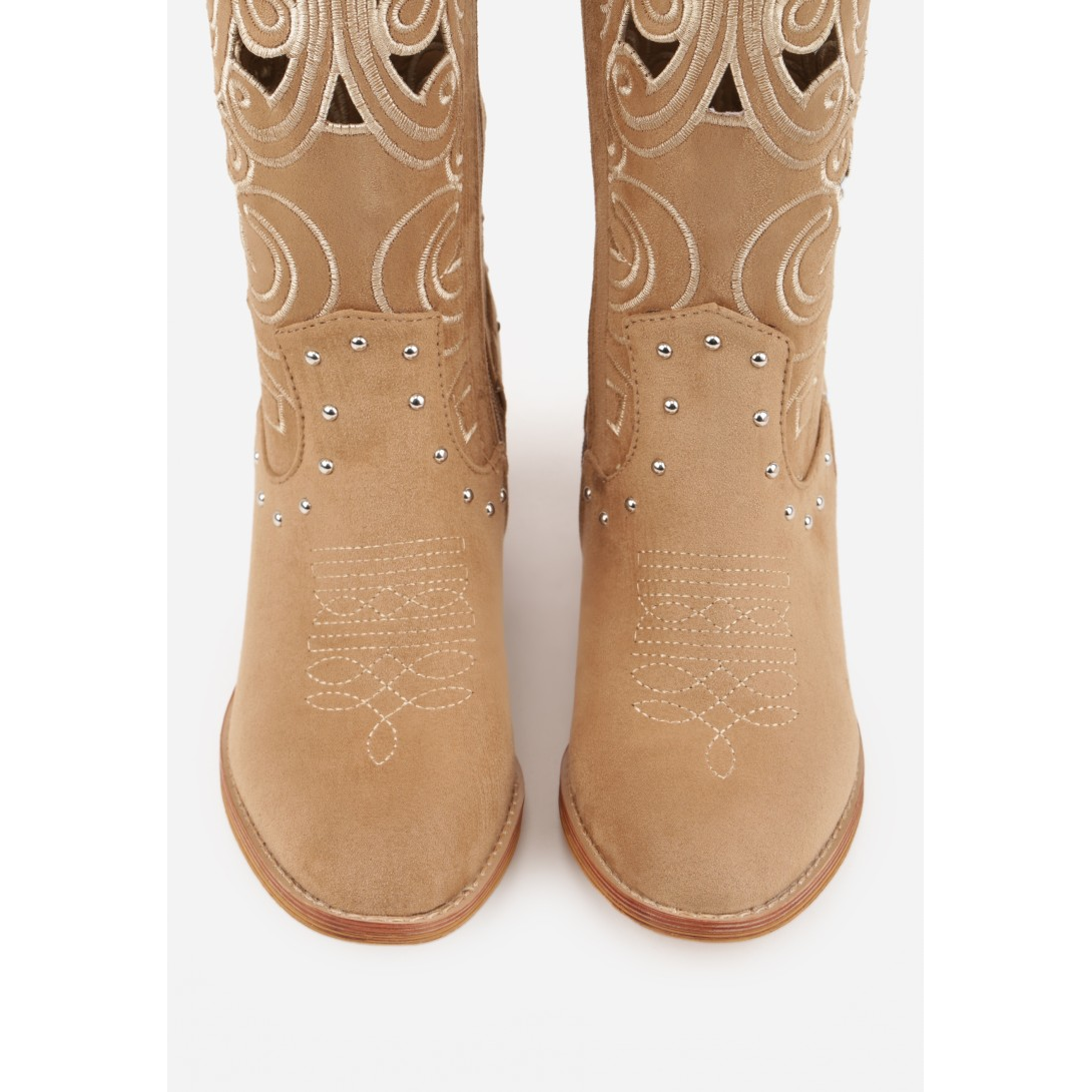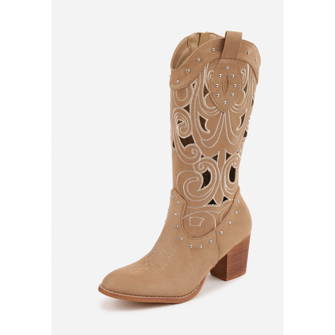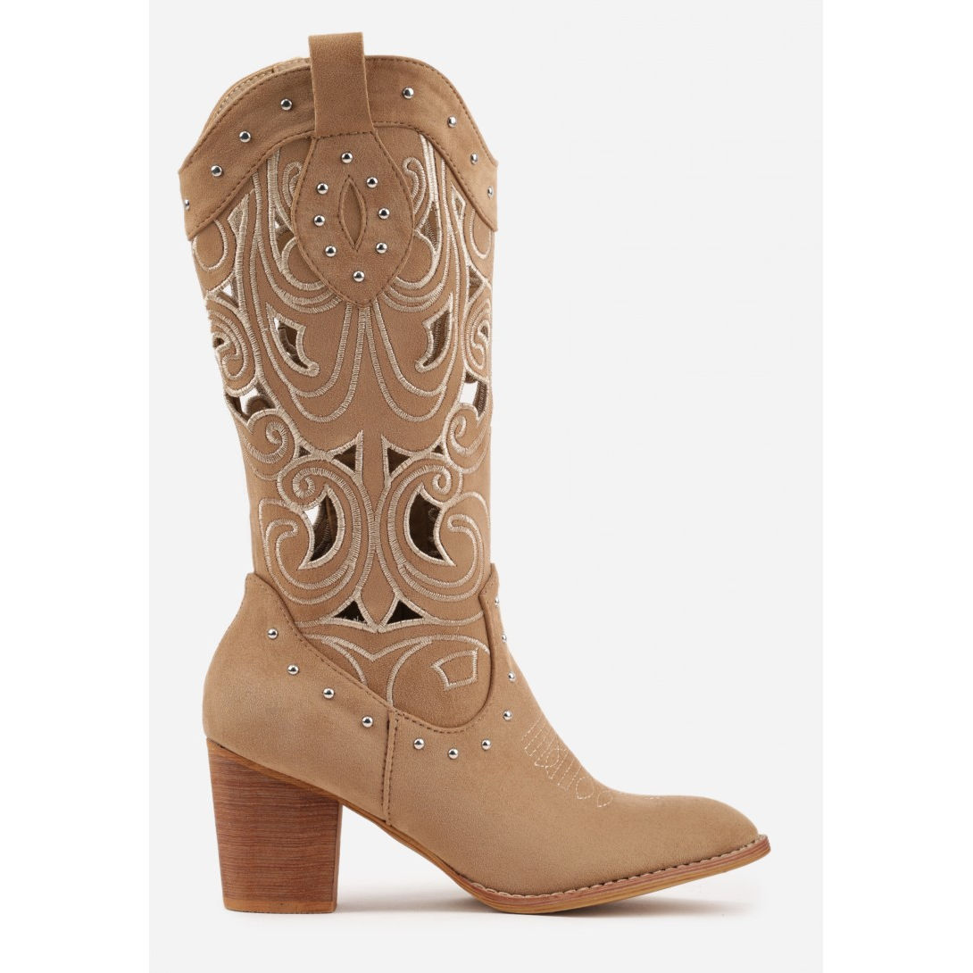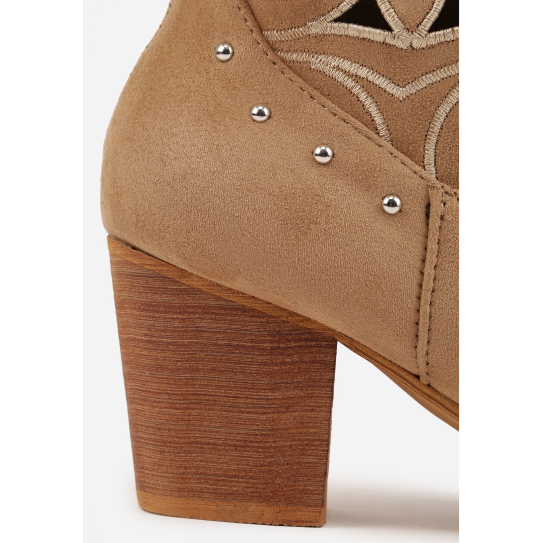 Botki z ozdobnym wycięciem, pięknie zdobione kryształkami, idealnie podkreślające każdą stylizację. Wykonane z miękkiego materiału imitującego zamsz, z ociepleniem wewnętrznym, co zapewnia komfort w chłodniejsze dni. Osadzone na stabilnym obcasie o wysokości 7 cm, z klasycznym noskiem w kształcie migdała oraz praktycznym zapięciem na zamek błyskawiczny z boku.