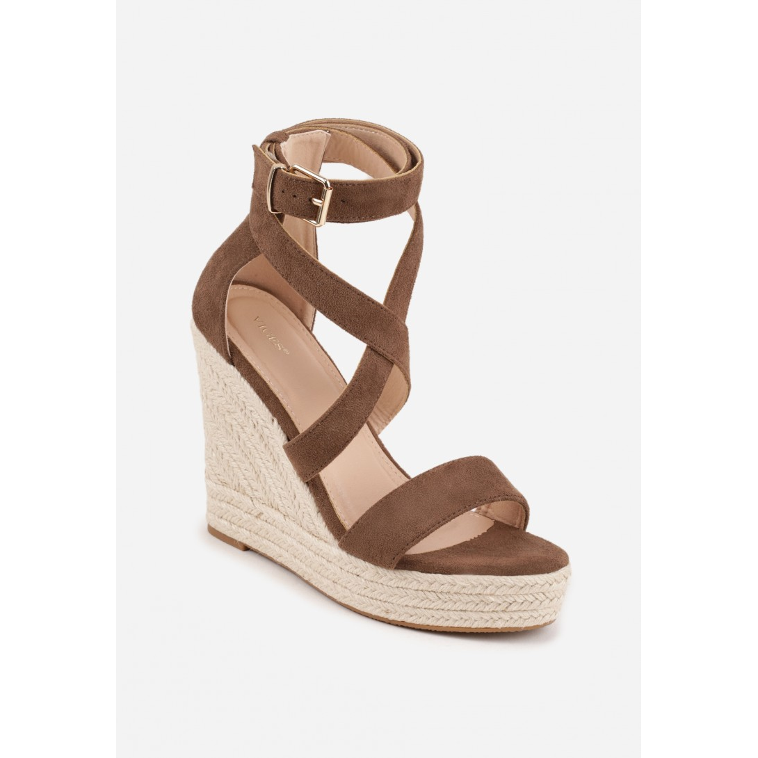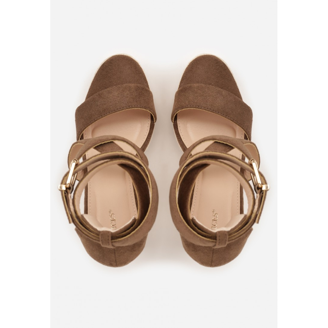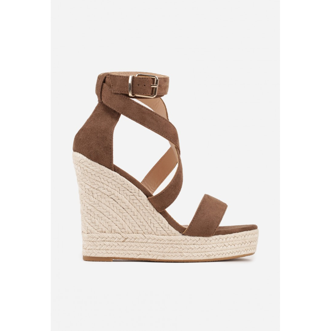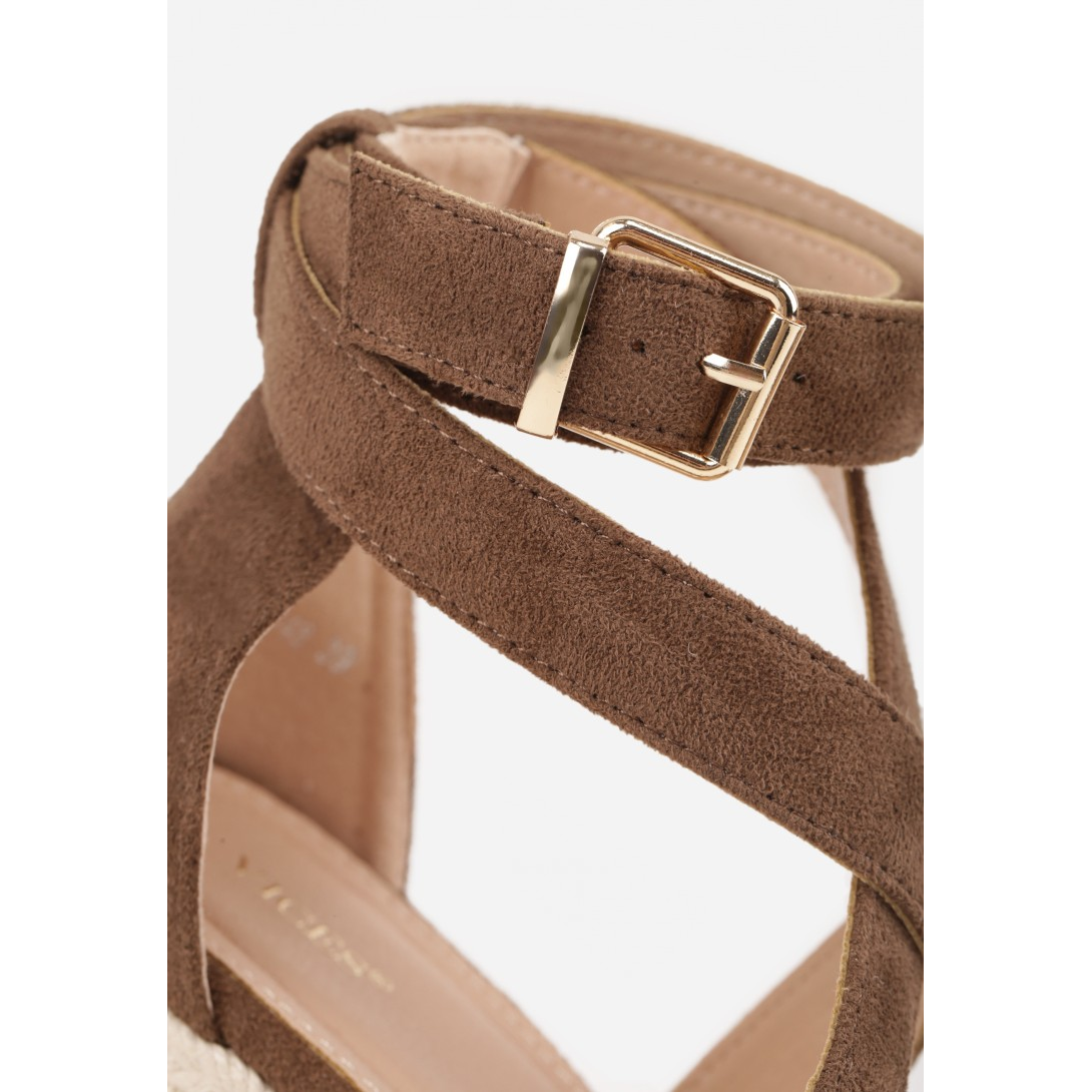 Stylowe sandały na koturnie, które doskonale dopełnią letnią garderobę. Wykonane z miękkiego zamszu, z wkładką z ekoskóry, zapewniają elegancki wygląd oraz trwałość użytkowania. Obcas o wysokości 9 cm, opleciony jutą, podkreśla nowoczesny design, a klasyczne zapięcie na sprzączkę sprawia, że sandały idealnie dopasowują się do stopy.