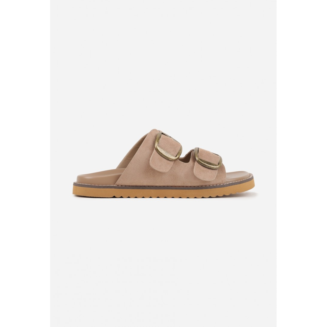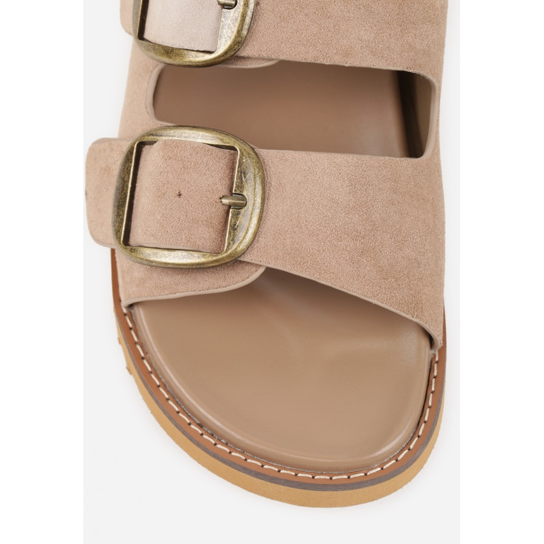 Sandały na płaskiej podeszwie z dwiema szerokimi klamrami, idealne na ciepłe dni. Wykonane z wysokiej jakości zamszu, z wkładką z tworzywa, co zapewnia trwałość i łatwość w utrzymaniu. Model zapinany na klamry, doskonały do noszenia w sezonie wiosenno-letnim, łączący nowoczesny styl z klasycznym wzornictwem.