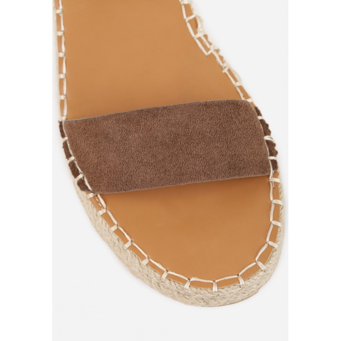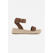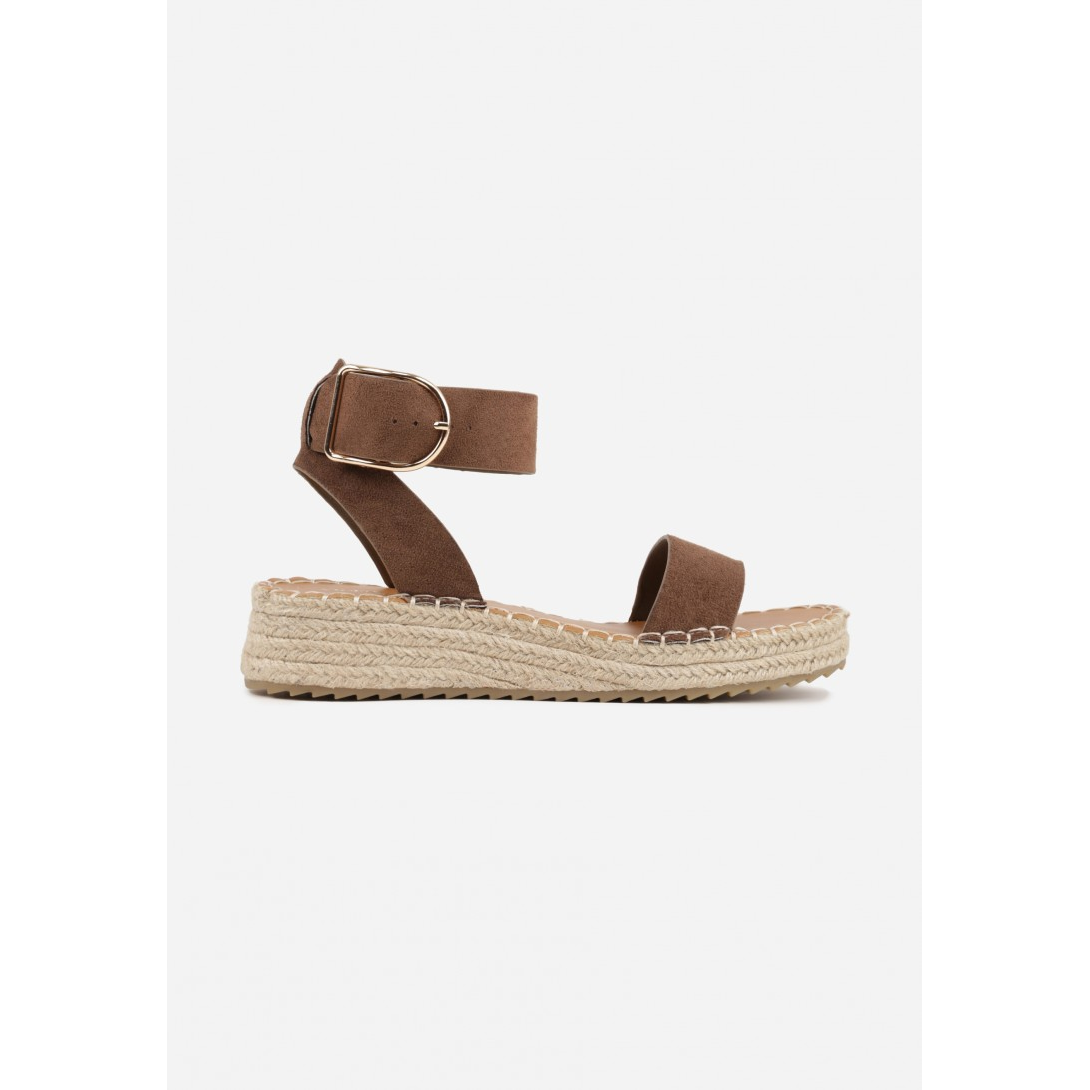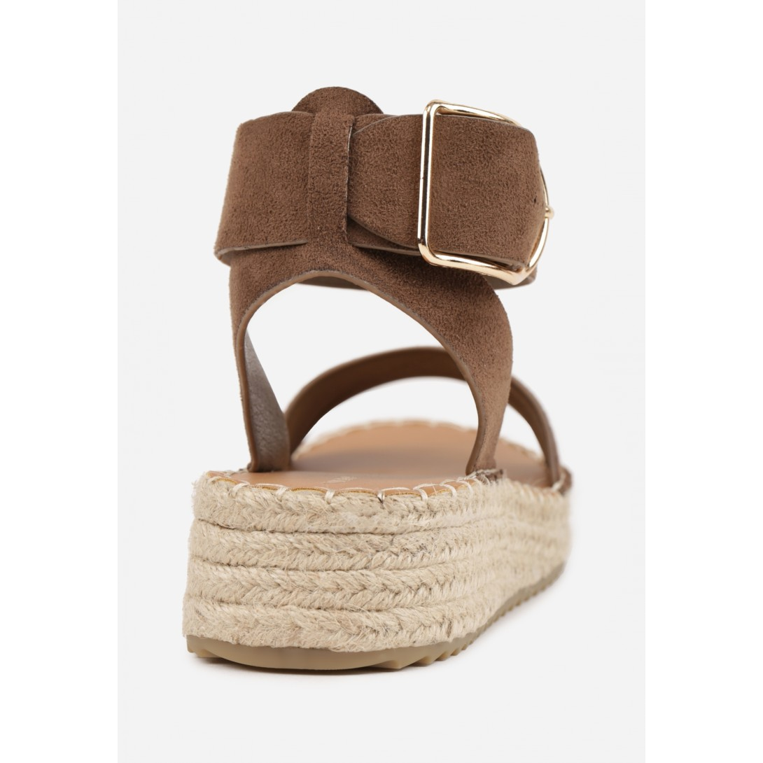 Sandały damskie na koturnie z zabudowaną piętą i regulowanym zapięciem na sprzączkę wokół kostki. Wykonane z materiału tekstylnego, z wkładką z ekoskóry oraz otwartym noskiem, osadzone na plecionym koturnie i platformie. Model w stylu casual z dekoracyjnym wykończeniem w formie plecionki, idealny na sezon wiosenno-letni.