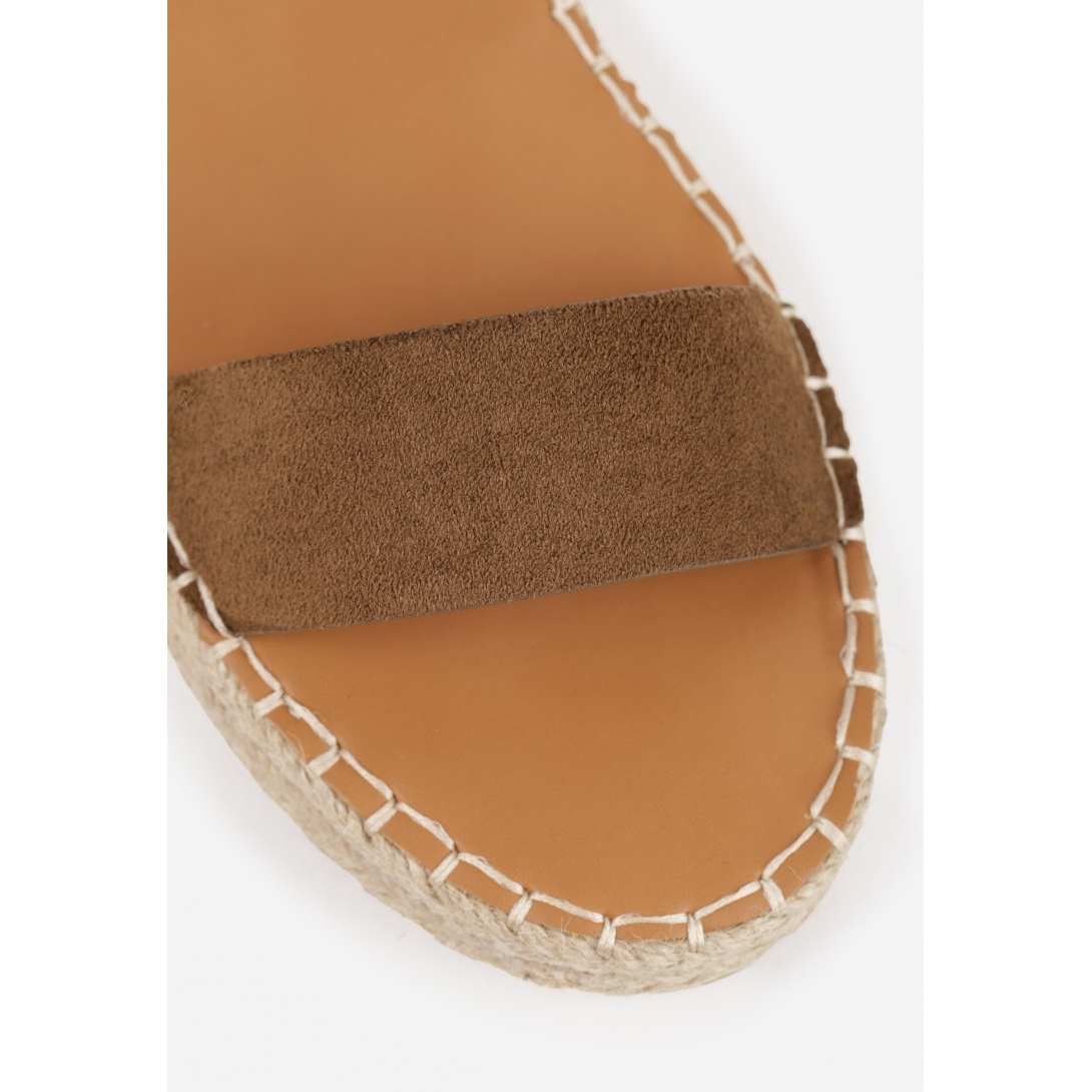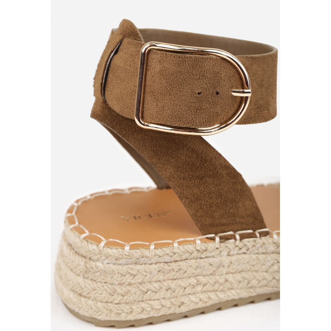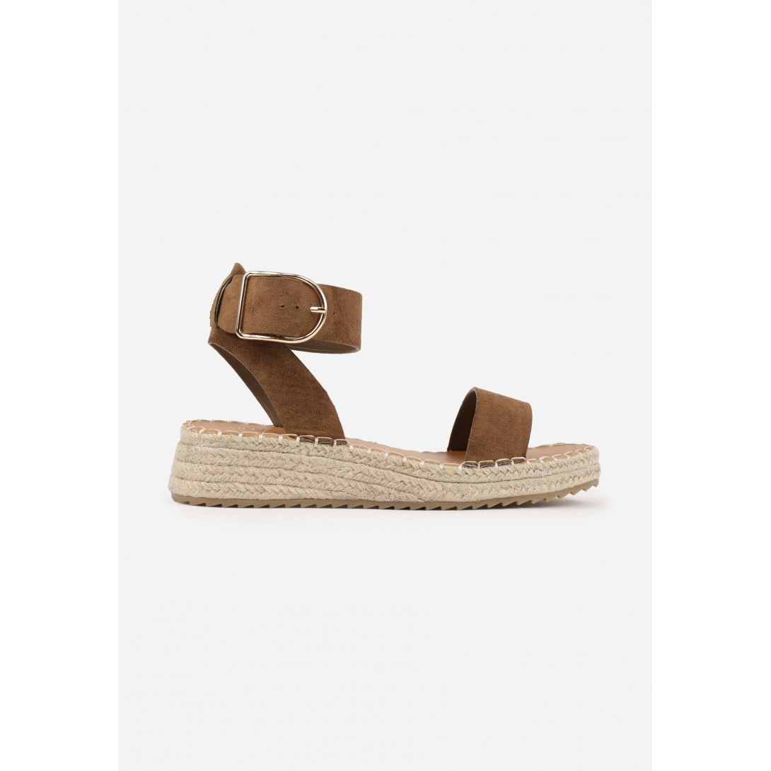 Sandały damskie na koturnie z zabudowaną piętą i regulowanym zapięciem na sprzączkę wokół kostki. Wykonane z materiału tekstylnego, z wkładką z ekoskóry oraz otwartym noskiem, osadzone na plecionym koturnie i platformie. Model w stylu casual z dekoracyjnym wykończeniem w formie plecionki, idealny na sezon wiosenno-letni.