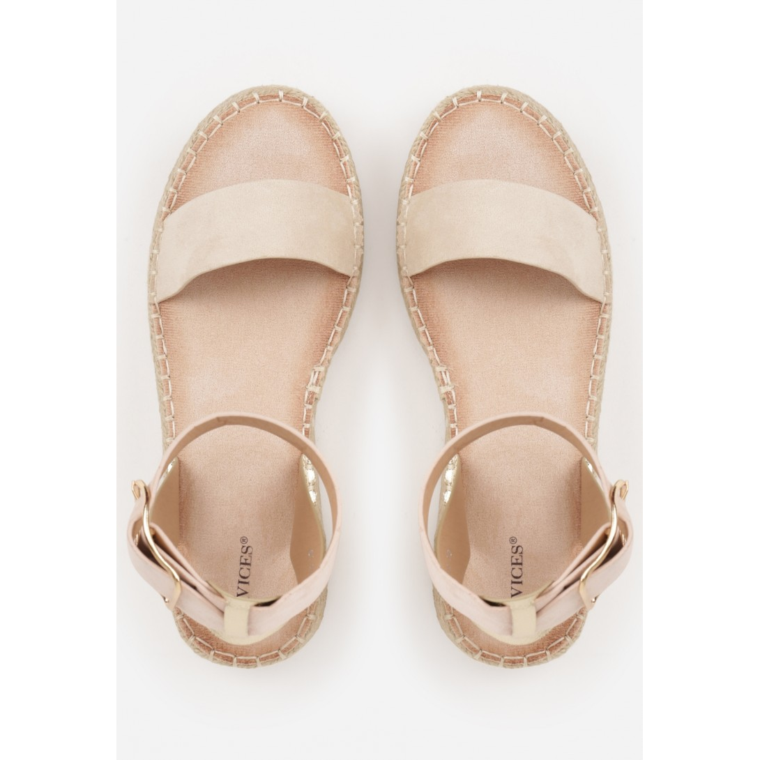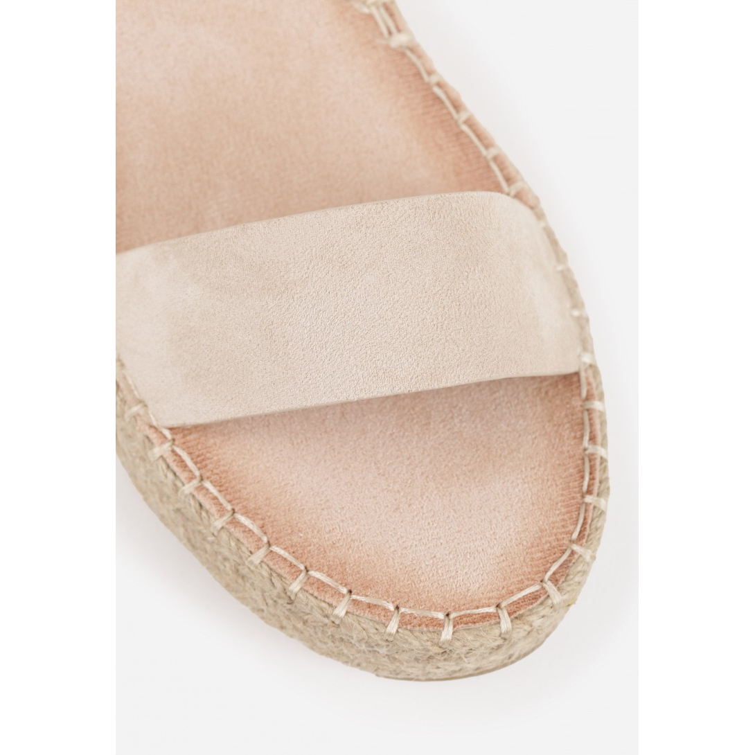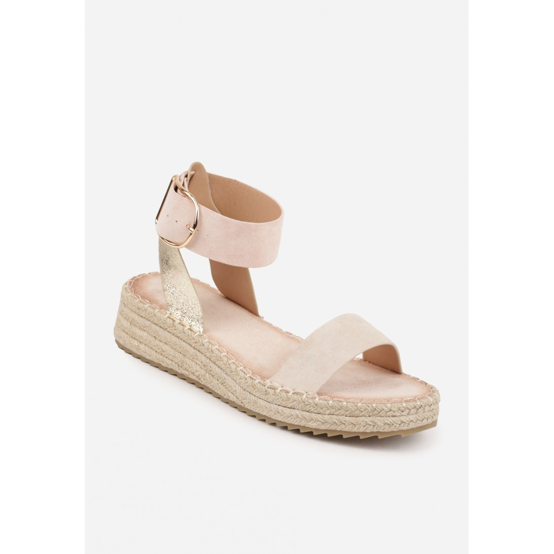 Sandały damskie na koturnie z zabudowaną piętą i regulowanym zapięciem na sprzączkę wokół kostki. Wykonane z materiału tekstylnego, z wkładką z ekoskóry oraz otwartym noskiem, osadzone na plecionym koturnie i platformie. Model w stylu casual z dekoracyjnym wykończeniem w formie plecionki, idealny na sezon wiosenno-letni.
