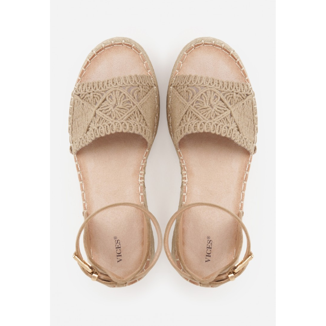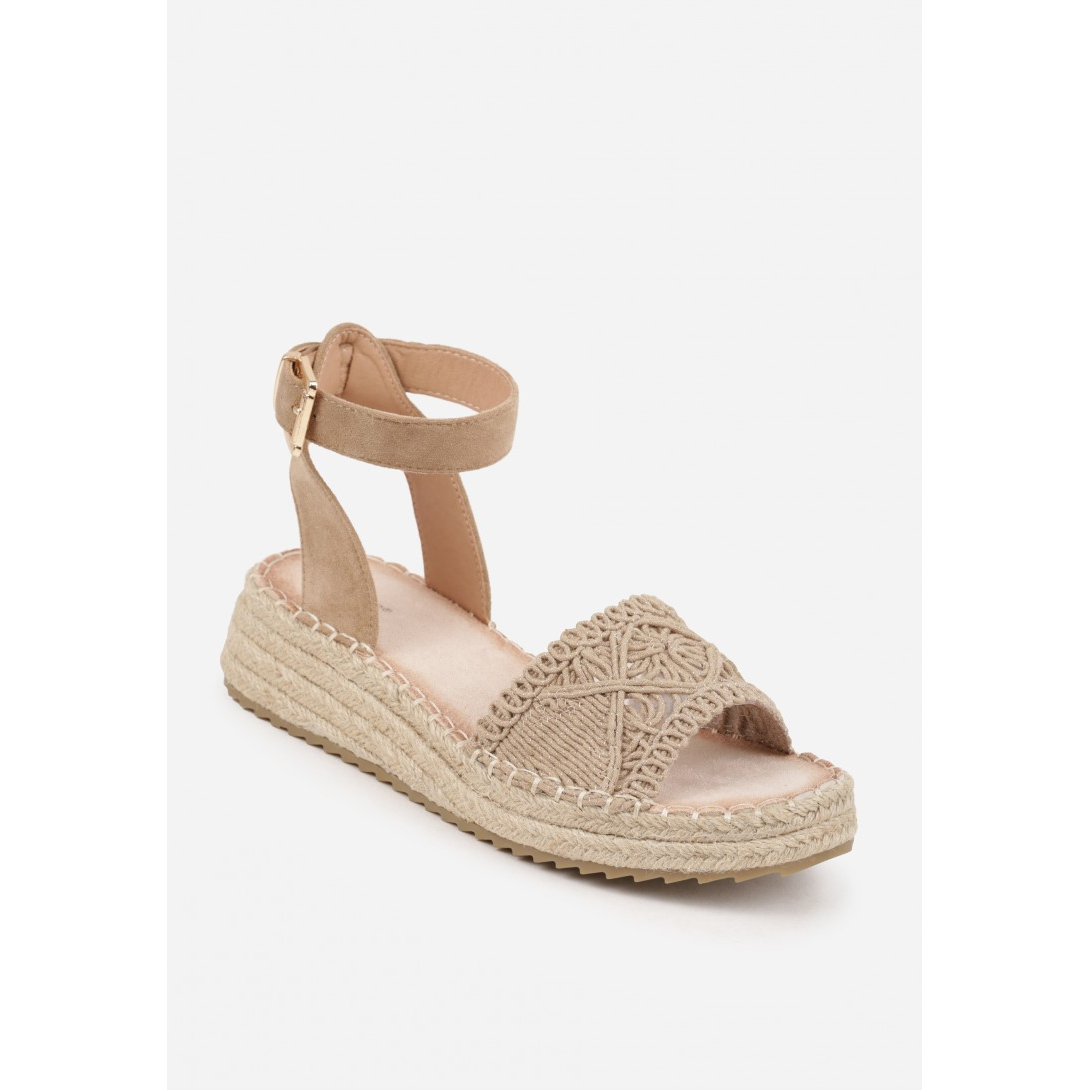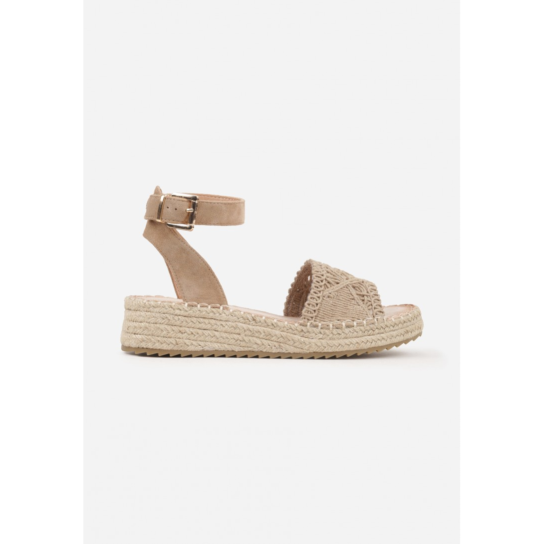 Ażurowe sandały damskie na plecionej platformie, wykonane z materiału o dekoracyjnym, boho wykończeniu i zapinane na regulowany pasek ze sprzączką wokół kostki. Model z odkrytym noskiem, wkładką z ekoskóry oraz stylową, stabilną podeszwą na koturnie. Idealne na sezon letni, utrzymane w casualowym stylu, z efektownym wzorem plecionki i subtelnymi zdobieniami w formie dekoracyjnych splotów.