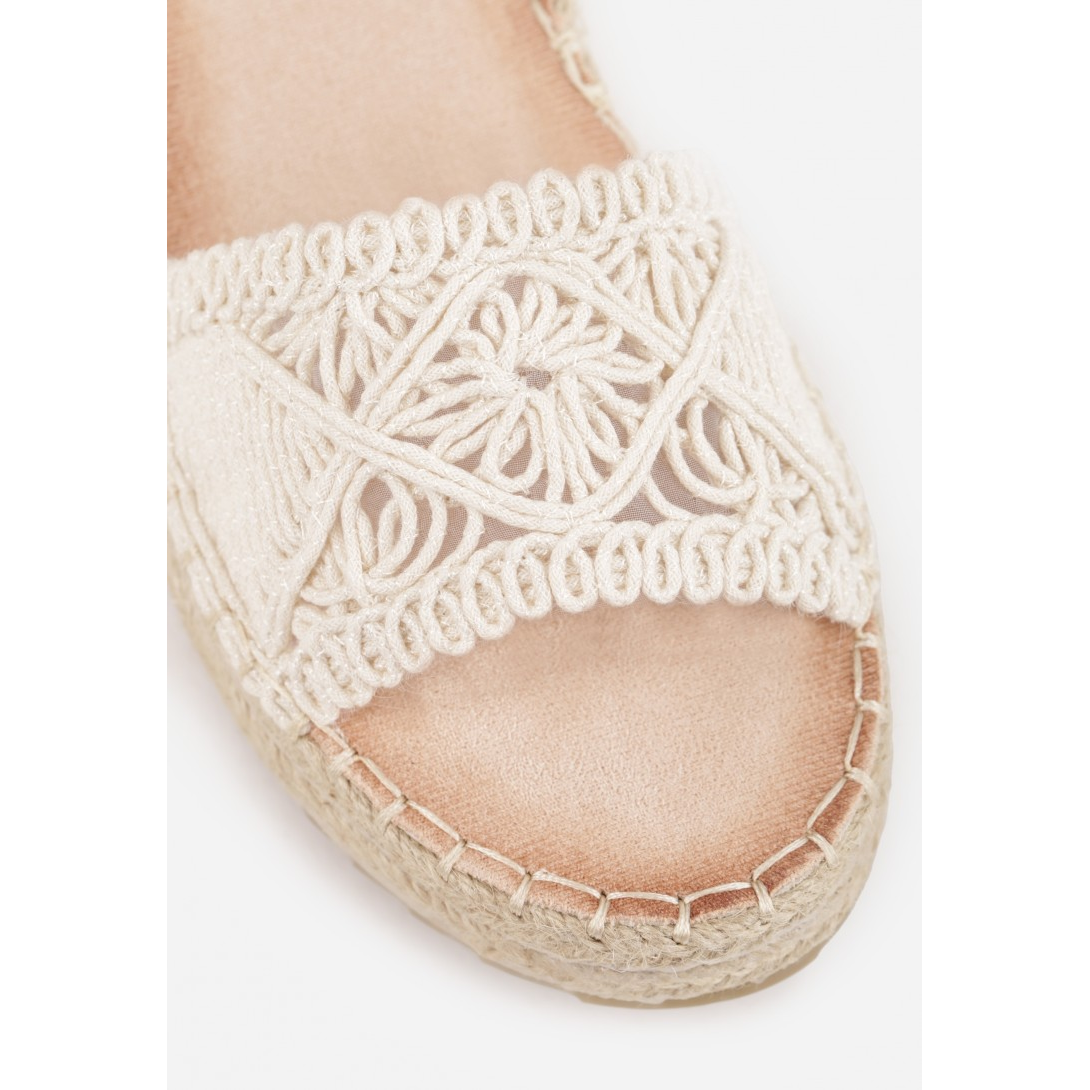 Ażurowe sandały damskie na plecionej platformie, wykonane z materiału o dekoracyjnym, boho wykończeniu i zapinane na regulowany pasek ze sprzączką wokół kostki. Model z odkrytym noskiem, wkładką z ekoskóry oraz stylową, stabilną podeszwą na koturnie. Idealne na sezon letni, utrzymane w casualowym stylu, z efektownym wzorem plecionki i subtelnymi zdobieniami w formie dekoracyjnych splotów.