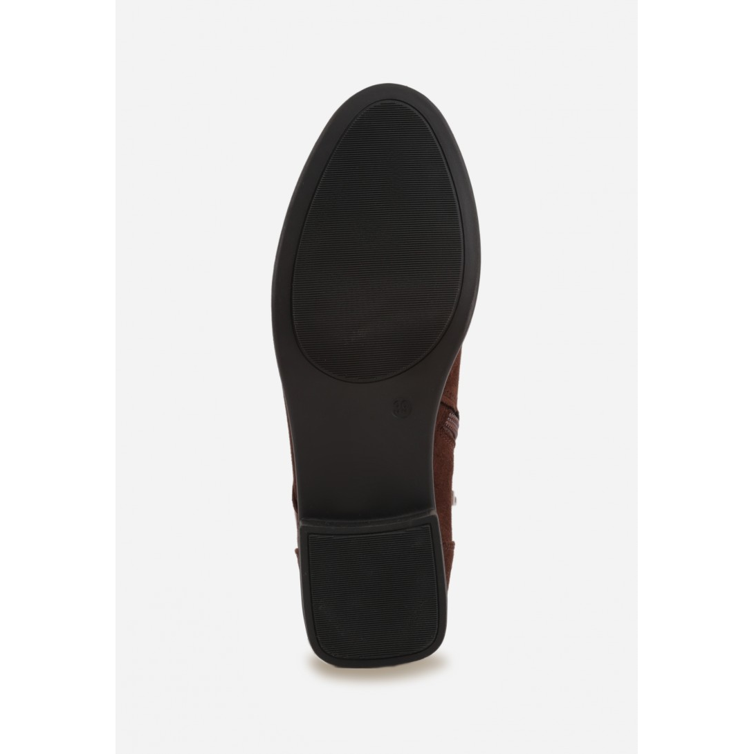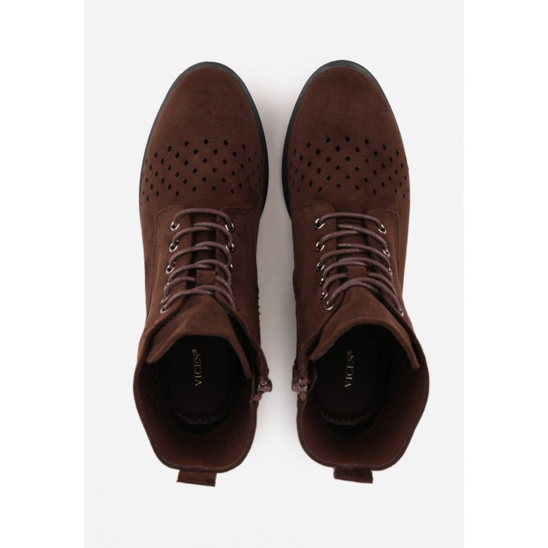Botki damskie sznurowane wykonane z materiału tekstylnego o ażurowej, perforowanej cholewce, osadzone na niskim, stabilnym obcasie. Model bez ocieplenia, z tekstylną wkładką i wyściółką, ze szpiczastym noskiem oraz klasycznym sznurowaniem. Styl casual z dekoracyjnym ażurowym wzorem i subtelnymi zdobieniami przy cholewce, idealny na sezon przejściowy.