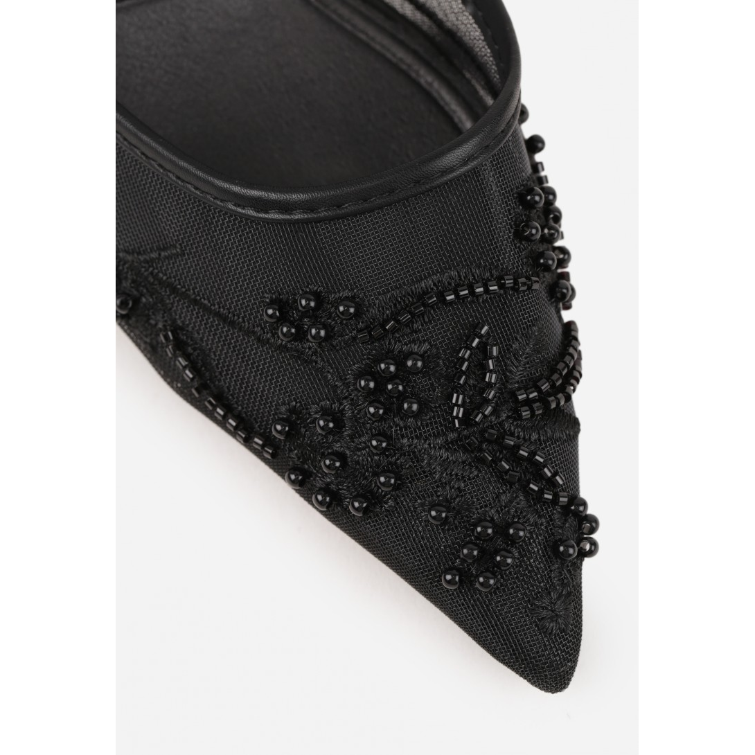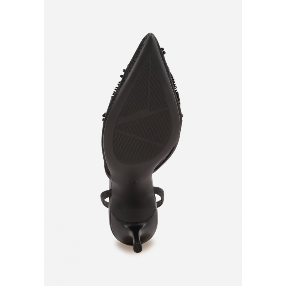 Eleganckie damskie czółenka z odkrytą piętą, osadzone na smukłym obcasie typu szpilka. Wykonane z materiału tekstylnego z wkładką ze skóry ekologicznej, ze spiczastym noskiem i zapięciem typu slingback. Model na sezon wiosenno-letni, utrzymany w stylu wizytowym, z delikatnym wzorem i efektownymi zdobieniami z perełek oraz koralików.