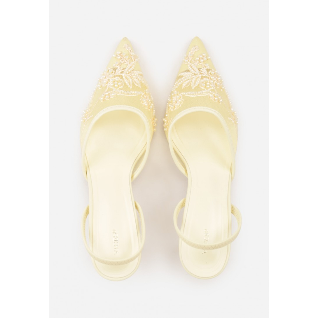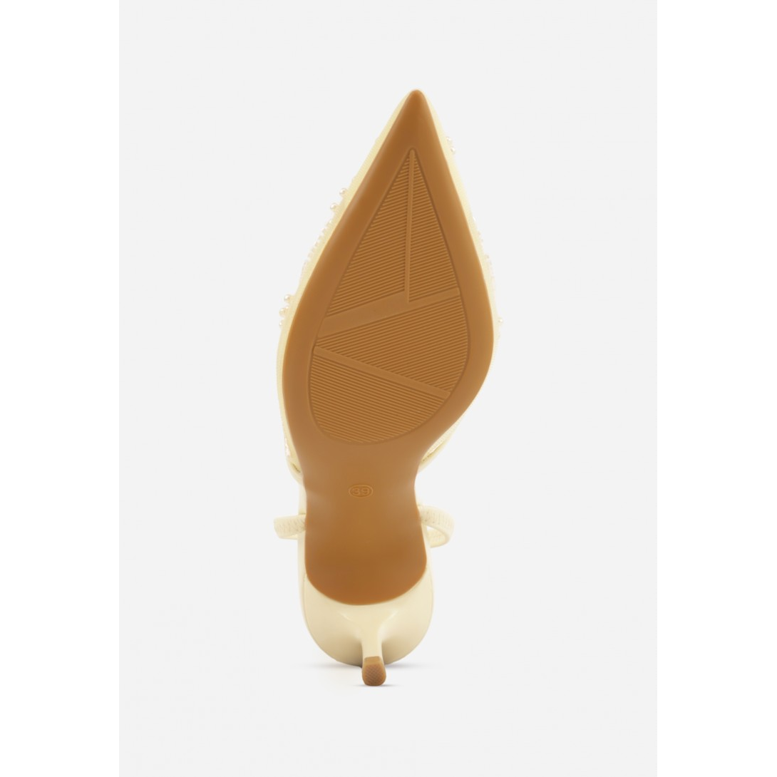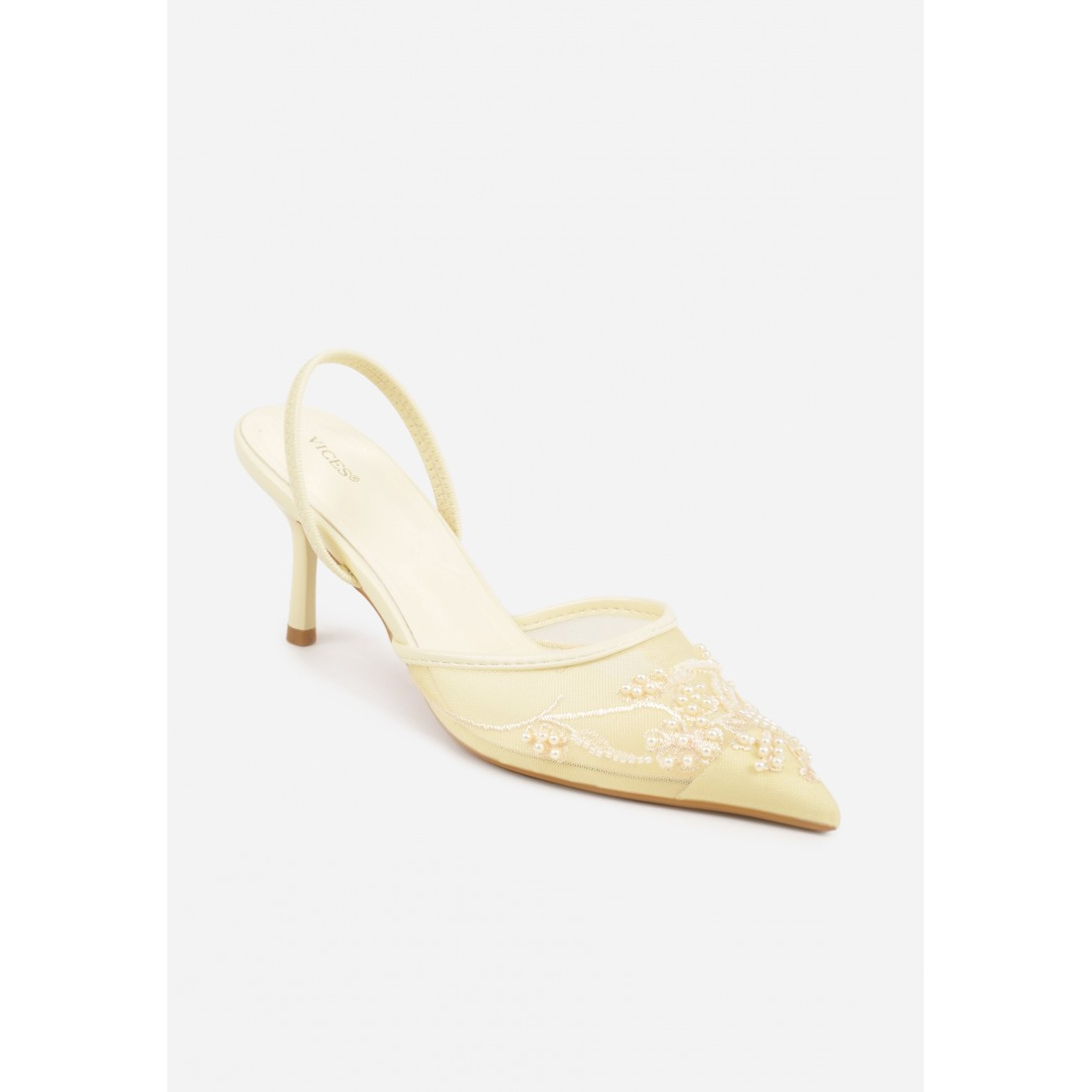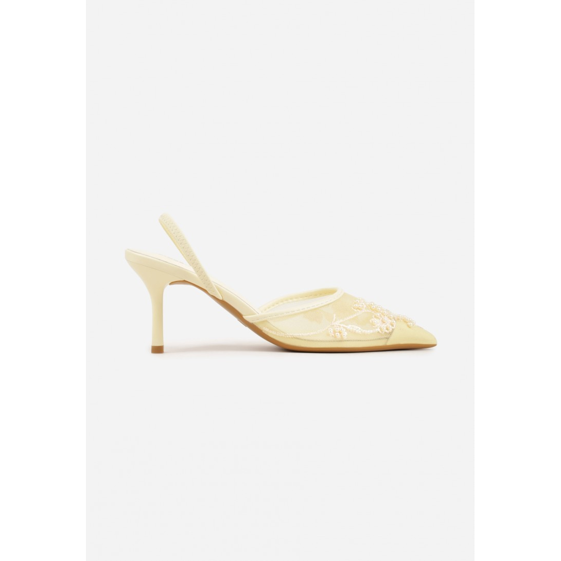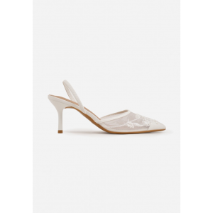 Eleganckie damskie czółenka z odkrytą piętą, osadzone na smukłym obcasie typu szpilka. Wykonane z materiału tekstylnego z wkładką ze skóry ekologicznej, ze spiczastym noskiem i zapięciem typu slingback. Model na sezon wiosenno-letni, utrzymany w stylu wizytowym, z delikatnym wzorem i efektownymi zdobieniami z perełek oraz koralików.
