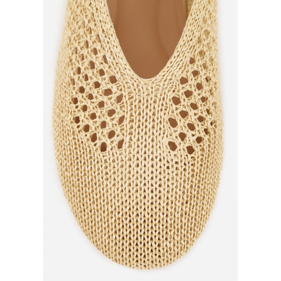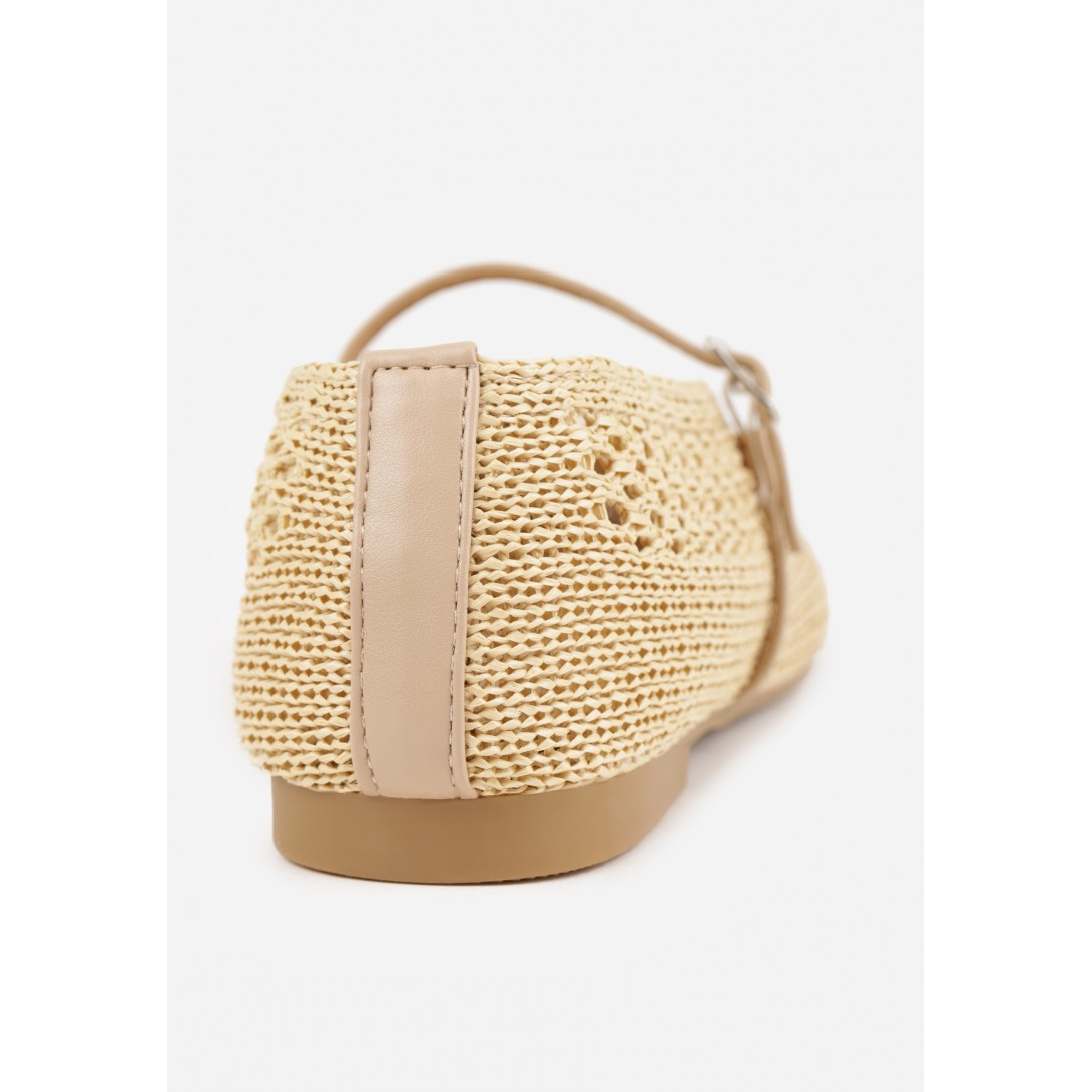 Ażurowe baleriny damskie wykonane z materiału tekstylnego, z delikatną wkładką ze skóry ekologicznej. Model ze szpiczastym noskiem, zapinany cienkim paskiem z klamerką, osadzony na płaskim obcasie; idealny na sezon wiosenno-letni. Styl casual, z dekoracyjnym splotem i subtelnym ażurowaniem, które podkreślają lekkość fasonu.