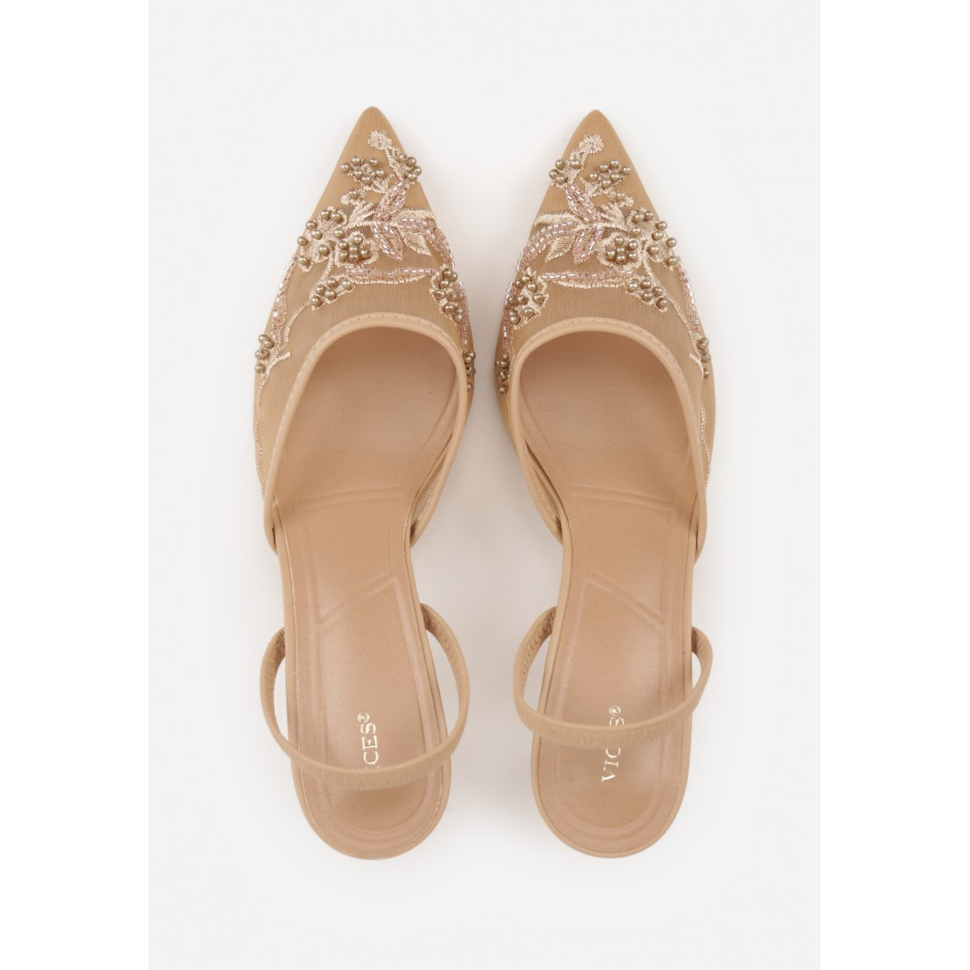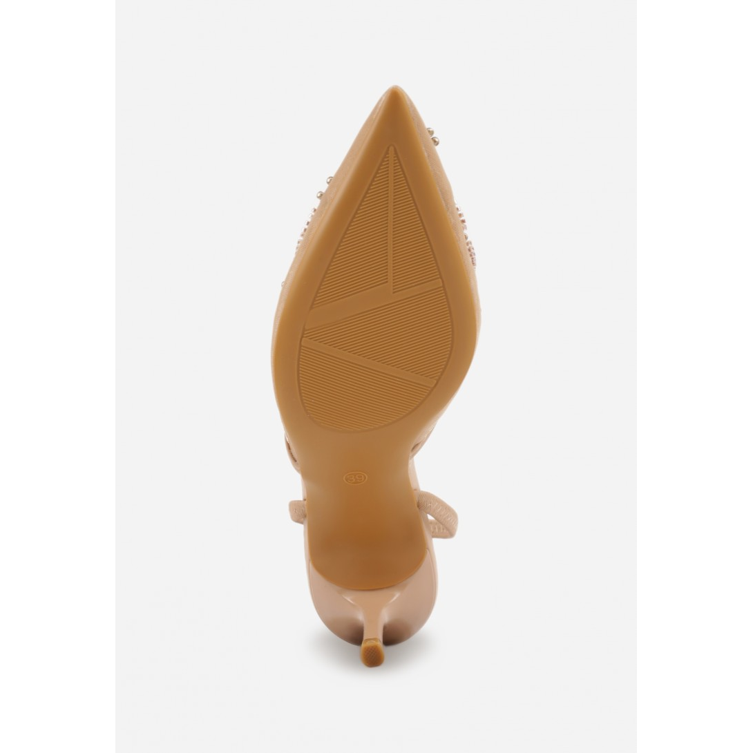 Eleganckie damskie czółenka z odkrytą piętą, osadzone na smukłym obcasie typu szpilka. Wykonane z materiału tekstylnego z wkładką ze skóry ekologicznej, ze spiczastym noskiem i zapięciem typu slingback. Model na sezon wiosenno-letni, utrzymany w stylu wizytowym, z delikatnym wzorem i efektownymi zdobieniami z perełek oraz koralików.
