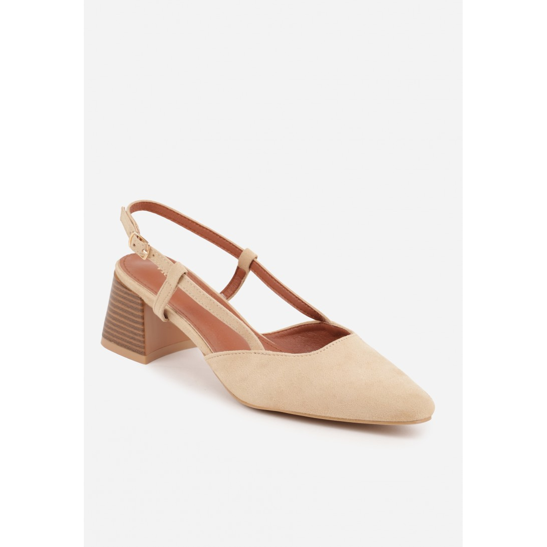 Czółenka damskie z zabudowanym, spiczastym noskiem oraz paskiem zapinanym na sprzączkę wokół kostki. Model wykonany z materiału tekstylnego, z wkładką ze skóry ekologicznej, osadzony na stabilnym słupku o żebrowanej fakturze. Idealne na sezon wiosna-lato, w eleganckim stylu z gładkim wzorem i subtelnym zdobieniem w postaci pasków.