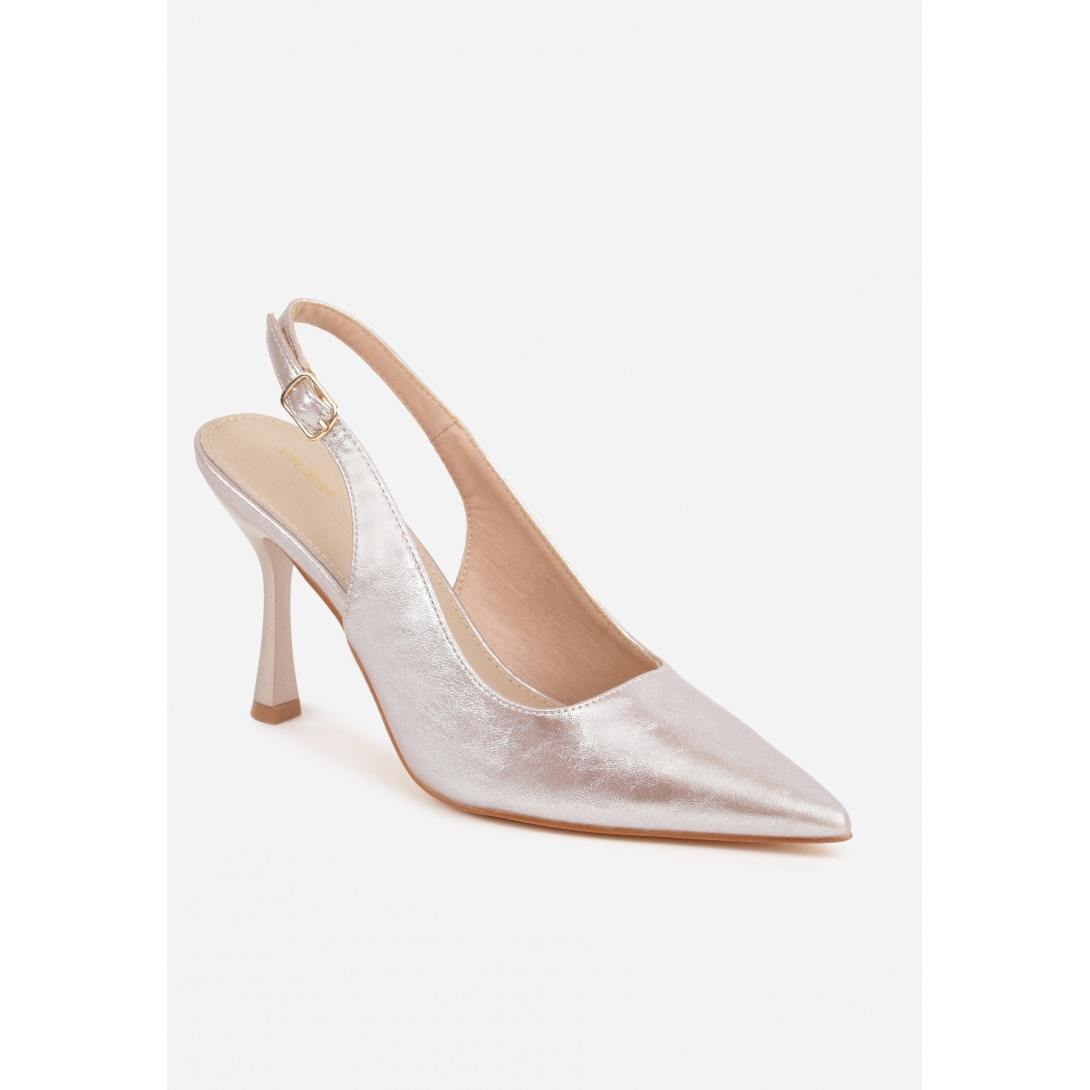 Eleganckie czółenka damskie wykonane ze skóry ekologicznej, z wyprofilowanym noskiem w szpic i zapięciem na pasek ze sprzączką przy pięcie. Model osadzono na wysokim, geometrycznym obcasie typu szpilka, a wkładkę i wyściółkę wykonano z ekoskóry; całość uzupełnia gładki wzór oraz subtelne zdobienie w postaci połyskującego wykończenia, idealne na sezon wiosenno-letni i stylizacje wieczorowe.