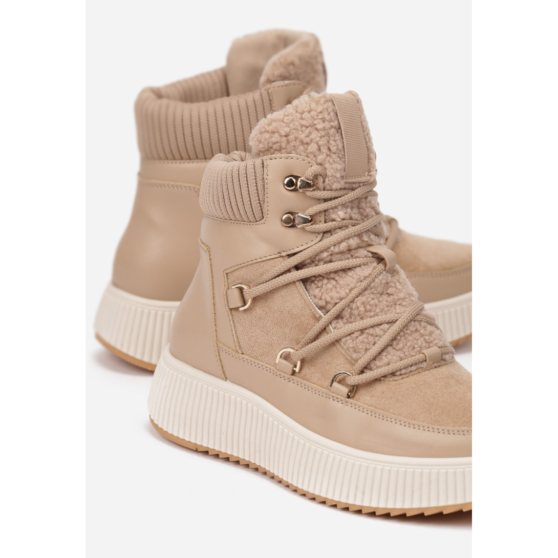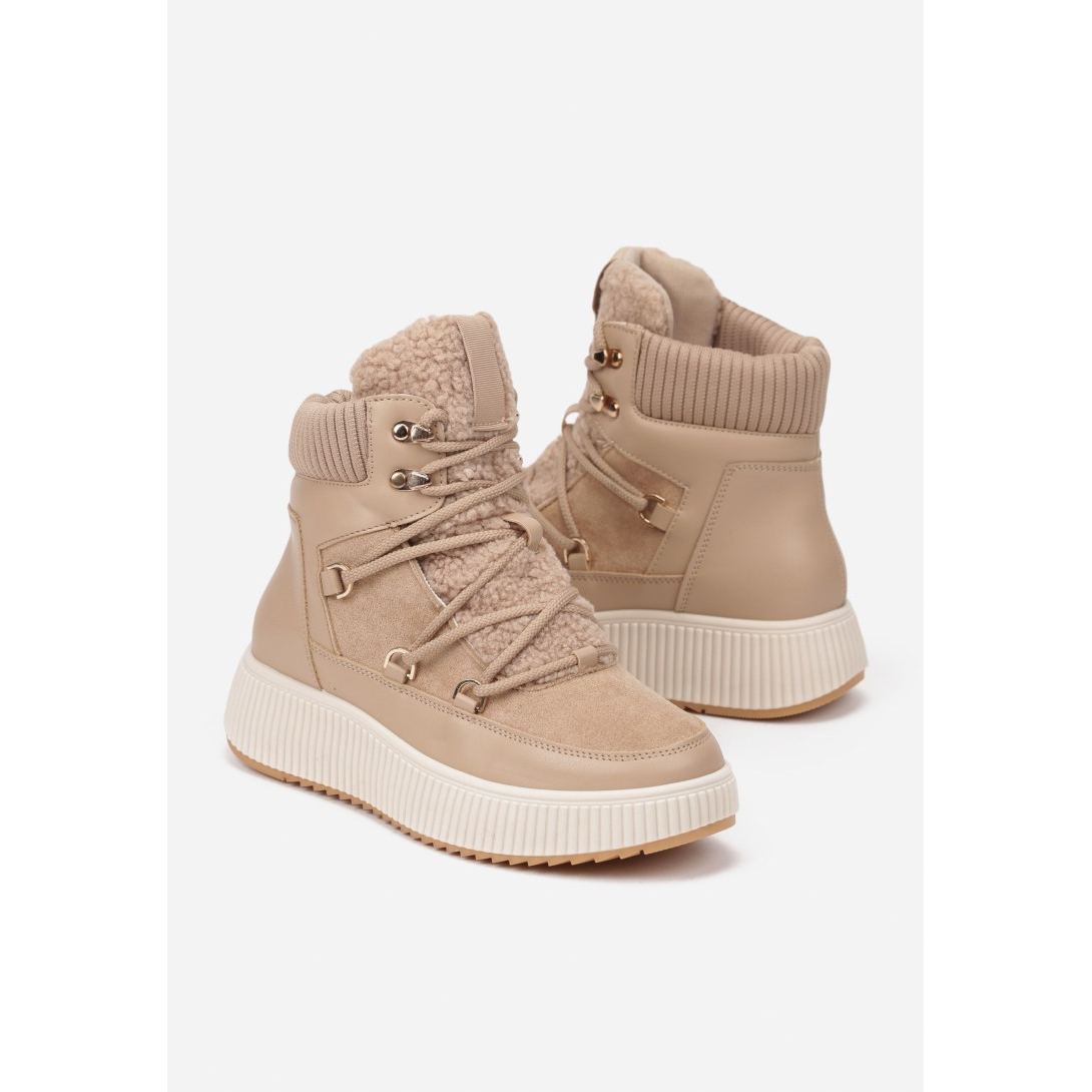 Stylowe buty zimowe z wysokim cholewką, wykonane z miękkiego materiału syntetycznego. Posiadają ocieplenie, które zapewnia komfort w chłodne dni oraz wkładkę z ekoskóry dla lepszej wentylacji. Zapięcie na sznurówki oraz solidna podeszwa o ciekawej strukturze dodają nietuzinkowego charakteru.