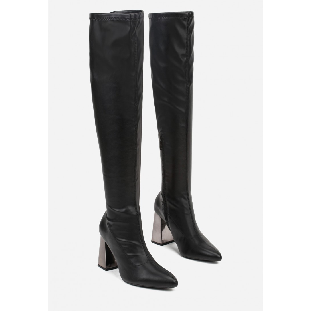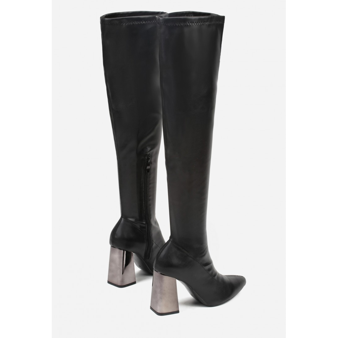 Długie kozaki na obcasie kwadratowym, idealne na sezon jesienno-zimowy. Wykonane z wysokiej jakości materiału syntetycznego, z ociepleniem wewnętrznym oraz wkładką z ekoskóry, która zapewnia wygodę użytkowania. Buty posiadają smukły noski oraz zapięcie na zamek błyskawiczny z boku, co ułatwia zakładanie i zdejmowanie.