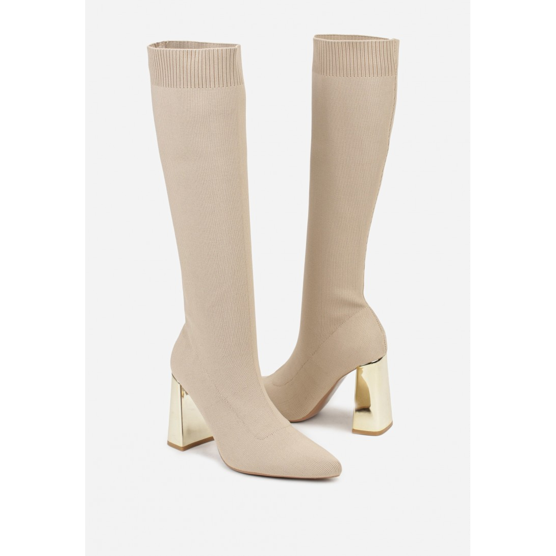Kozaki na wysokim obcasie z materiału stretch, perfekcyjnie dopasowujące się do nogi. Osadzone na efektownej podstawie w kształcie sześcianu, która ma wysokość 9 cm, co dodaje elegancji każdej stylizacji. Zapięcie na suwak z boku oraz noski w szpic nadają całości nowoczesny charakter, idealny na sezon wiosenno-jesienny.