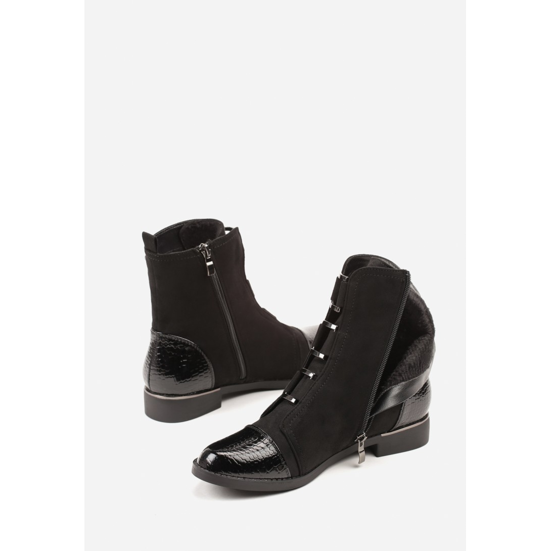 Eleganckie botki damskie z zamkiem błyskawicznym. Wykonane z wysokiej jakości materiałów, z ociepleniem zapewniającym ciepło, idealne na chłodniejsze dni. Klasyczny nosek w kształcie migdała oraz solidna podeszwa świetnie komponują się z modnym designem, a metalowe zdobienia dodają całości nowoczesnego charakteru.